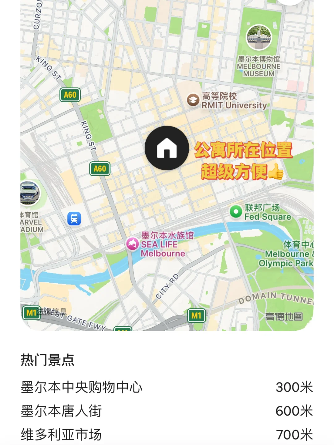 这间民宿的地理位置绝佳,到维多利亚市场仅700米,去维多利亚州立图书馆、福林德街火车站等著名景点都在1.5公里以内,🚶很轻松,沿途还能欣赏墨尔本独特的街景和人文风情