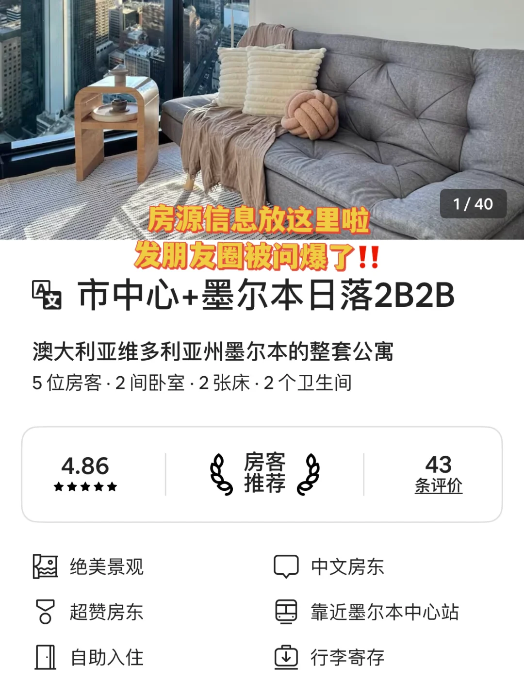 这间民宿真的很棒,一家人都很享受在这里的时光,重点是这样可以住下五个人的神仙公寓,一晚只要1k多,相当于人均200+!爸妈直说好香!强烈安利给来墨尔本旅游的姐妹们!