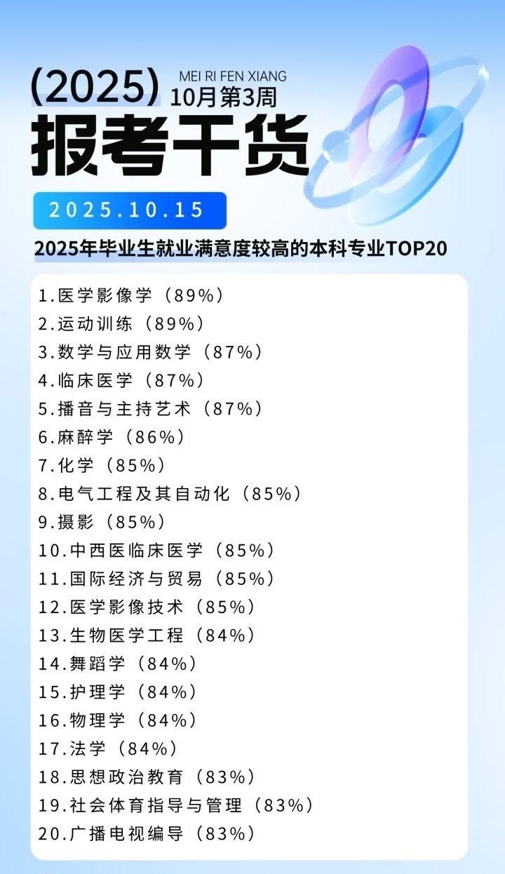【高考解读—2026 志愿填报知识分享】2025年毕业生就业满意度较高的本科专业TOP20! 根据麦克思《2025年中国本科生就业报告》显示,近五年,应届本科毕业生的就业满意度持续攀升,从2020届的71%上升至2024届的81%;从不同类型院校来看,2024届地方本科院校毕业生就业满意度为81%,超过“双一流”院校(78%)。这一变化,反映了一是毕业生就业观念更加理性,二是高校就业服务体系不断完善,通过强化就业指导、优化校企合作、丰富实习实践等服务,使得毕业生能够建立更合理的职业预期。 这几年,大家在报考志愿时更多的考虑的是就业的问题,不像以前,大家可能会考虑这个学校的属性,比如是否985,是否211双一流等,但是现在,如果你这个专业的就业不好,哪怕你是985,很有可能都会遭遇冷门,这就是时代的变迁,毕竟在就业为王的时代 谁都不想大学一毕业就失业,谁也不想空有一个985的名头,而未来坐吃空饷! 加油高考考生!学习志愿填报知识,填报不求人!为孩子明年的志愿填报保驾护航!