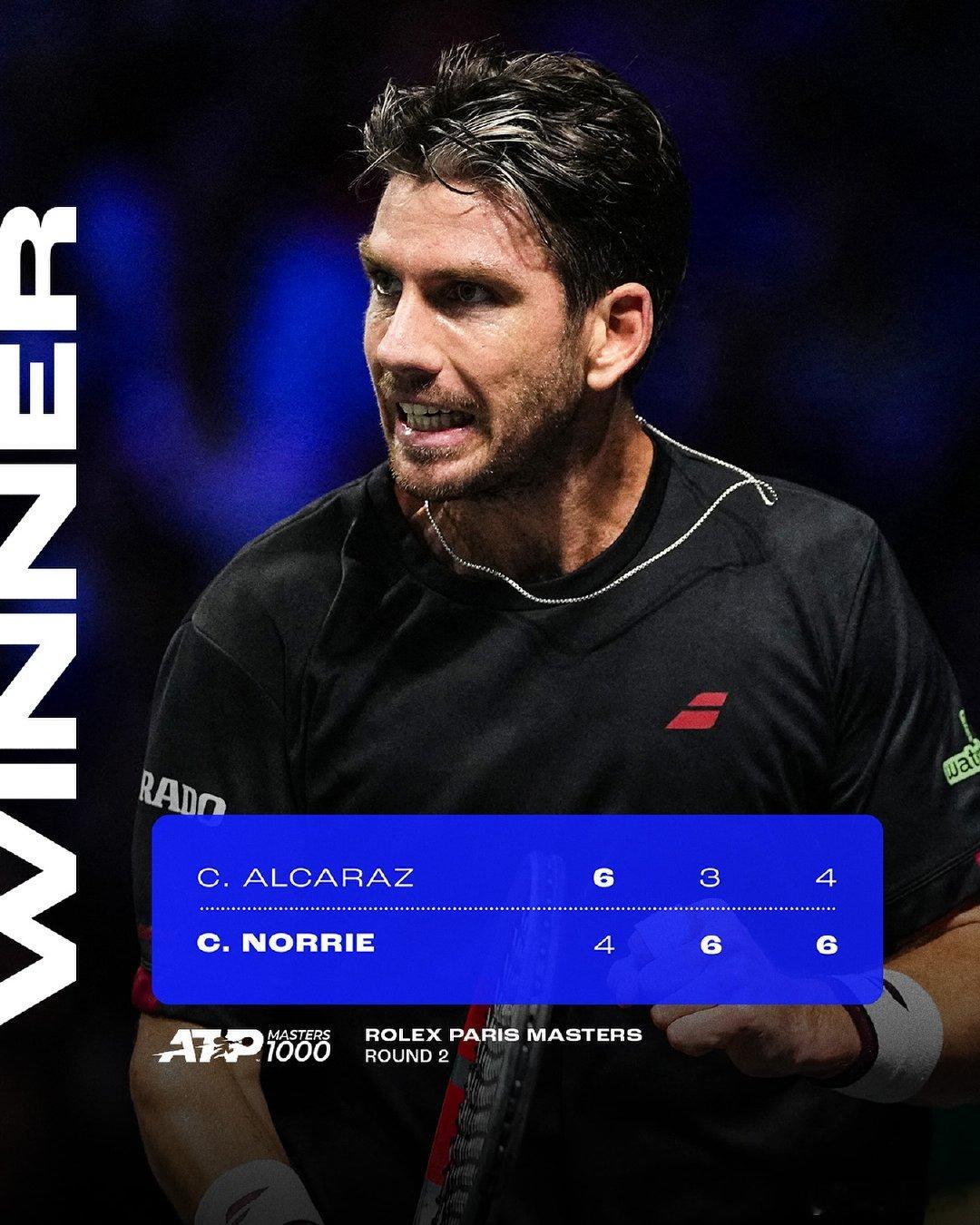 ATP1000巴黎大师赛第二轮,英国名将诺里4-6、6-3、6-4逆转世界第一阿尔卡拉斯,晋级16强