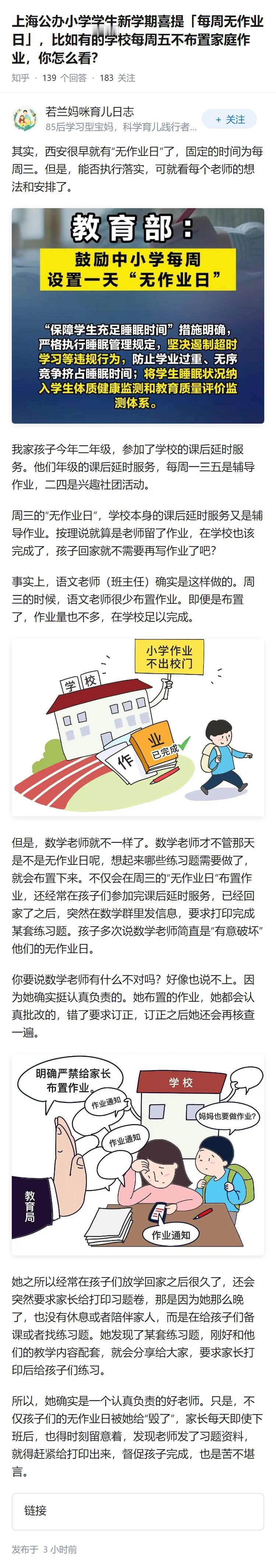 上海公办小学学生新学期喜提「每周无作业日」,比如有的学校每周五不布置家庭作业,你怎么看?
