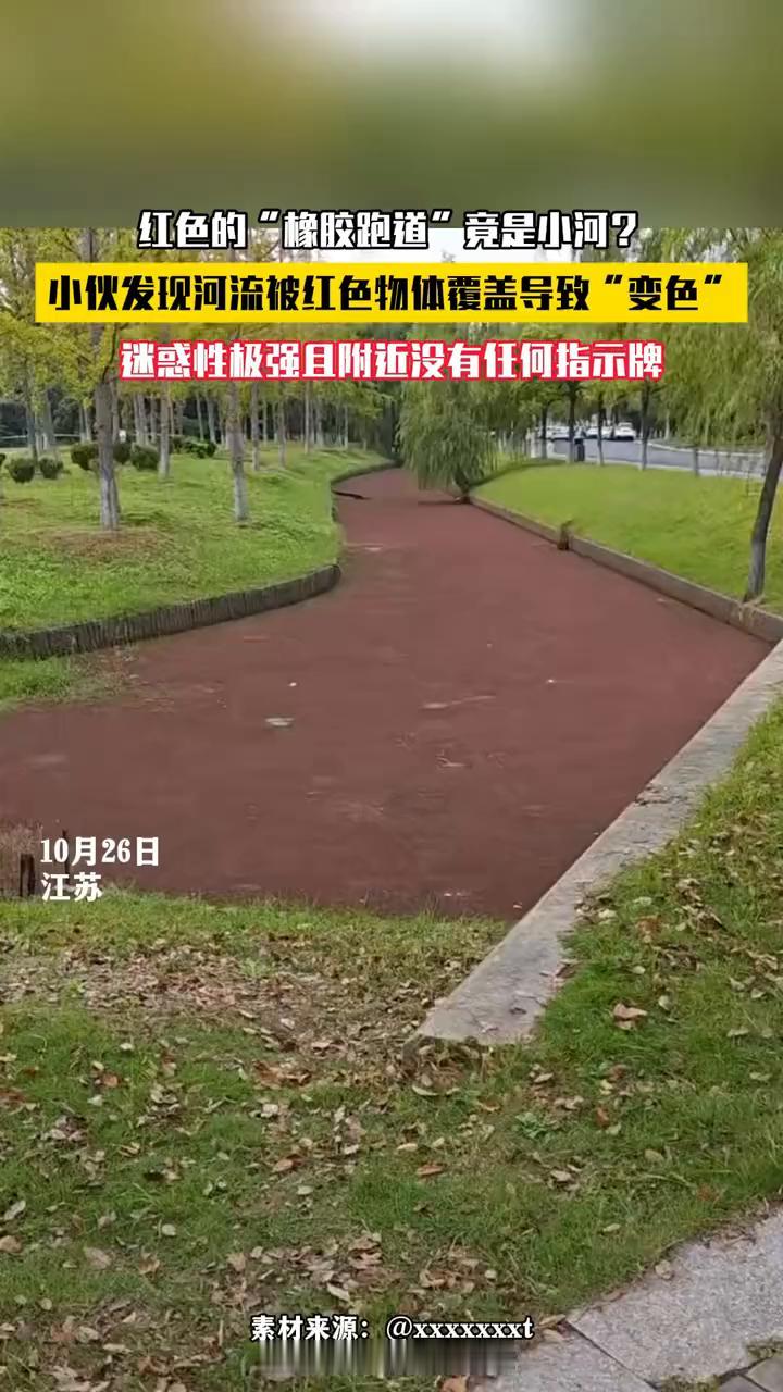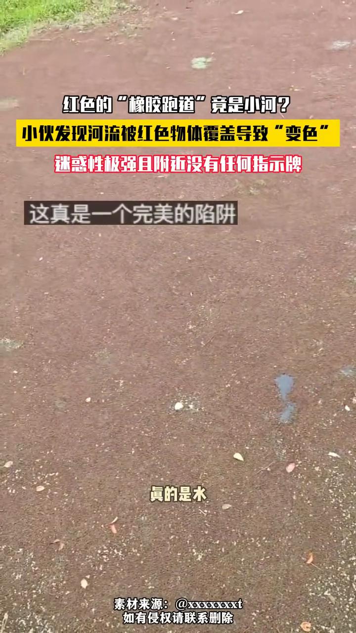 红色的"橡胶跑道"竟是小河?小伙发现河流被红色物体覆盖导致"变色",迷惑性极强且附近没有任何指示牌。 10月26日,江苏。你们看这个红色的,是不是很像橡胶跑道?但我记得以前明明是一个河的,现在拿两个石头来测试一下,真的是水。再你看这边周围都是绿色的树,哪里会出现这红色的东西? 传统的公园跑道应该有明显的警示牌,这样真的会误导很多人掉进去。网友分享的路边"河流"。橡胶跑道