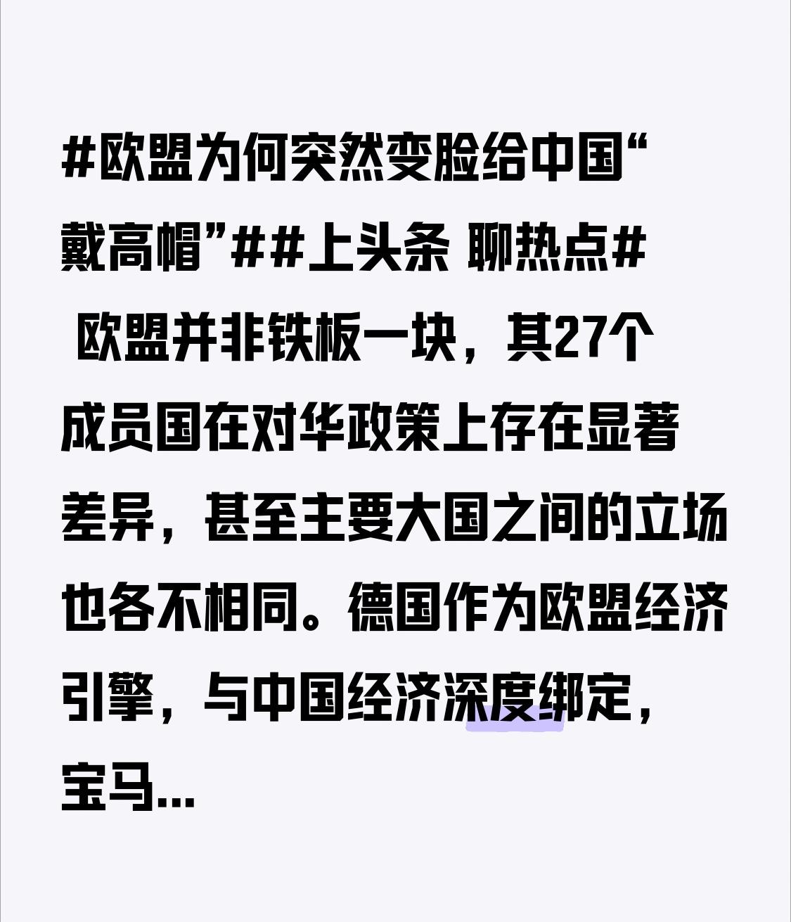 欧盟并非铁板一块,其27个成员国在对华政策上存在显著差异,甚至主要大国之间的立场也各不相同。德国作为欧盟经济引擎,与中国经济深度绑定,宝马、奔驰等车企在华销量占比常年维持在20%左右,巴斯夫等化工企业更是将稀土视为生产核心原料。这种深度依赖使得德国在对华强硬问题上表现出明显的犹豫不决。尽管德国总理默茨支持讨论使用“反胁迫机制”,但有德国官员明确警告,“若真的激活此工具,将面临经济反噬”。 法国的立场则更具保护主义色彩。马克龙政府推动对华强硬,一方面源于国内产业压力——雷诺等车企的电动车在华市场份额不足5%,面对中国电动车的竞争毫无招架之力;另一方面也有转移国内政治压力的考量。马克龙政府面临高失业率压力,把“对华强硬”包装成“保护本土就业”的口号,能暂时转移民众对其经济政策乏力的不满。 波兰等中东欧国家的立场则更多是地缘政治考量。波兰在中欧经贸中本无太多直接利益关联,其推动对华强硬的目的是讨好美国以获取更多北约安全援助,并在欧盟内部刷存在感。这种“无利不起早”的态度,本质上是想借对华议题搭车谋利,并非真的关心欧盟产业安全。 欧盟内部这种分歧导致其难以形成统一连贯的对华政策。根据智库数据,欧盟各国对华贸易政策分歧度高达43%。这种内部分裂注定了任何强硬的“报复”都只能停留在口头上,就连欧盟峰会上,各国都未就中国贸易问题展开正式辩论。
