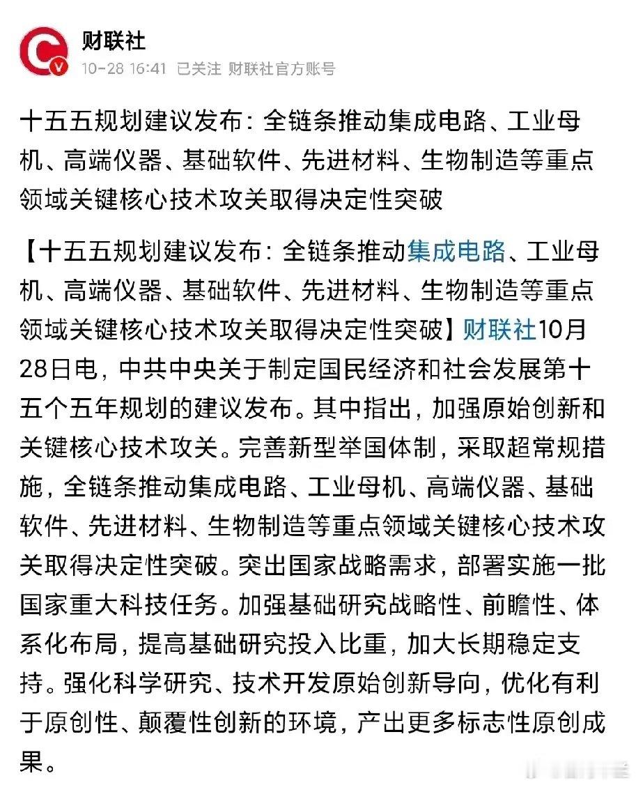 咱妈“十五五”规划建议,强调加强原始创新和关键核心技术攻关,完善新型举国体制,全链条推动集成电路、工业母机、高端仪器、基础软件、先进材料、生物制造等重点领域关键核心技术攻关取得决定性突破,同时注重基础研究投入与创新环境优化。