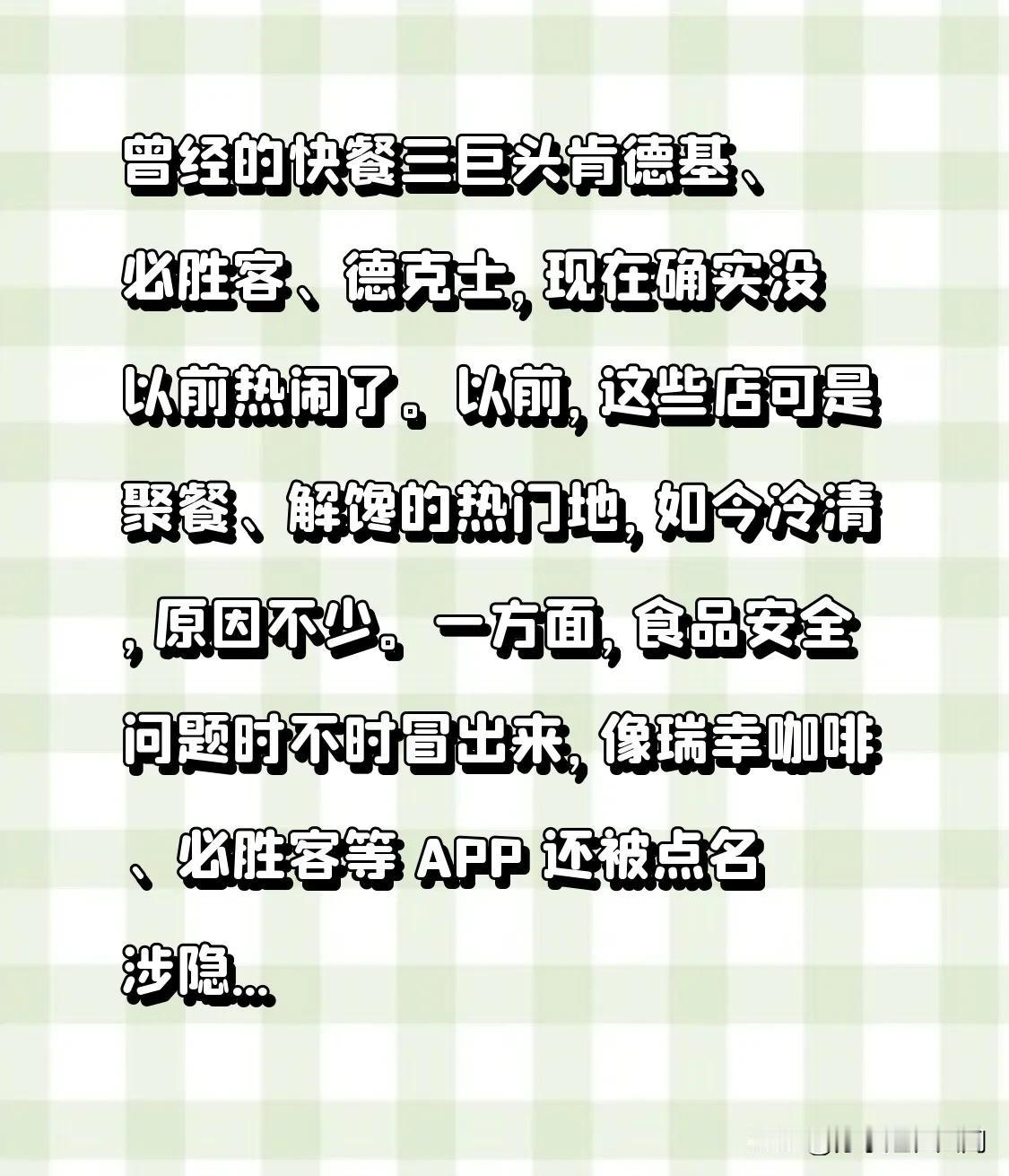 曾经的快餐三巨头肯德基、必胜客、德克士,现在确实没以前热闹了。以前,这些店可是聚餐、解馋的热门地,如今冷清,原因不少。一方面,食品安全问题时不时冒出来,像瑞幸咖啡、必胜客等 APP 还被点名涉隐私不合规,这让消费者好感度下降。另一方面,餐饮市场竞争太激烈,各种特色小吃、网红餐厅层出不穷。比如一些主打健康轻食的店,就吸引了不少注重养生的人。而且外卖兴起,大家足不出户就能吃美食,也没必要专门去店里。它们要是不赶紧改变,估计会越来越冷清。 德国肯德基 必胜客 必吃必胜客 必胜客汉堡套餐 德克士饭 德克士必吃榜 必胜客鸡饭