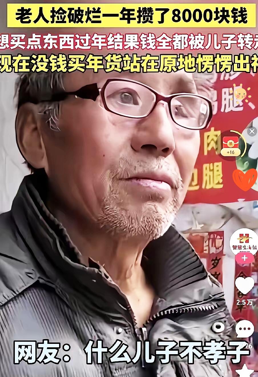 寒心呀! 老人捡破烂一年攒下8000块,转头就被儿子偷偷转走,这哪是偷钱,分明是抽走了老人活着的盼头。 总有人说这是个别不孝子,可细看才发现,这种“代际盘剥”早就藏在很多家庭里。 农村老人拿养老钱贴补儿孙,城里长辈掏空积蓄给子女买房,本质上都是一种无底线的索取。 别光骂孩子冷血,“啃老”往往是养出来的。 从小凡事包办,把孩子护在温室里,没教过他“付出才有回报”, 长大了自然觉得父母的钱就该是自己的。这不是孝顺不孝顺的问题,是根本没养出独立做人的底气。 真正的爱从不是无底线兜底,而是教会他自己走路。 你觉得该怎么让年轻人明白,靠父母的血汗钱撑不起体面人生?拾废品老人 拾破烂老人