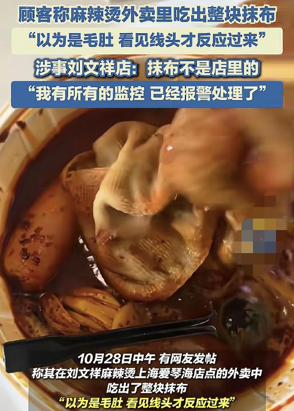 10月28日,上海一位网友发视频称在他点的一份麻辣烫外卖中发现了一块抹布,刚开始以为是毛肚。当发现是抹布之后,真的是食欲全无,把情况反馈给门店,要门店随即提出了退款的处理,但是网友并不认可,随后门店的老板称。要求把抹布寄回门店进行调查,是否为员工不小心放进去的,但是遭到了拒绝。门店老板称他后厨有诊断视频,但是都没有发现有问题。这样的事情越来越多希望能够得到最好的处理结果,不放过一个坏人,也不要冤枉一个好人。
