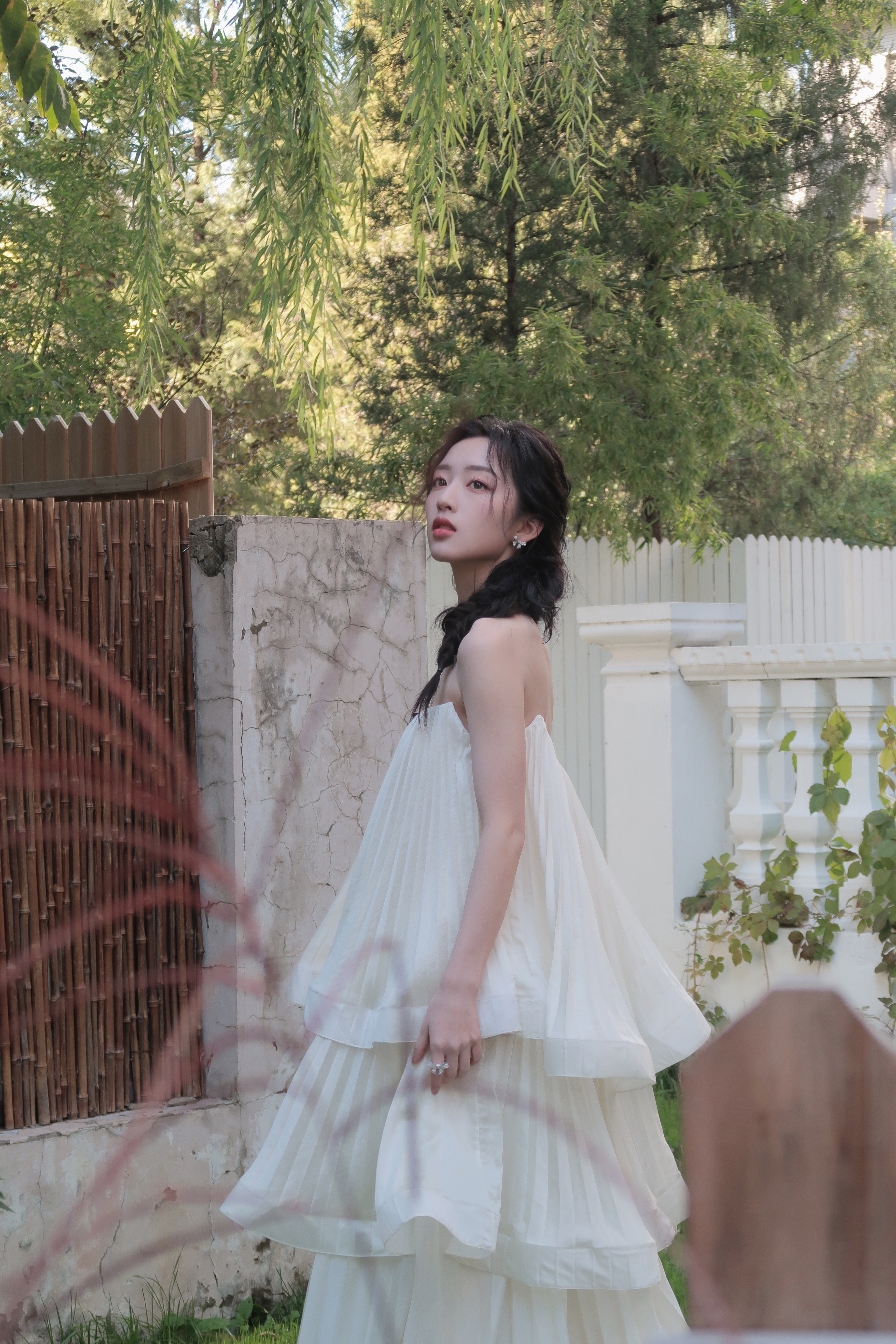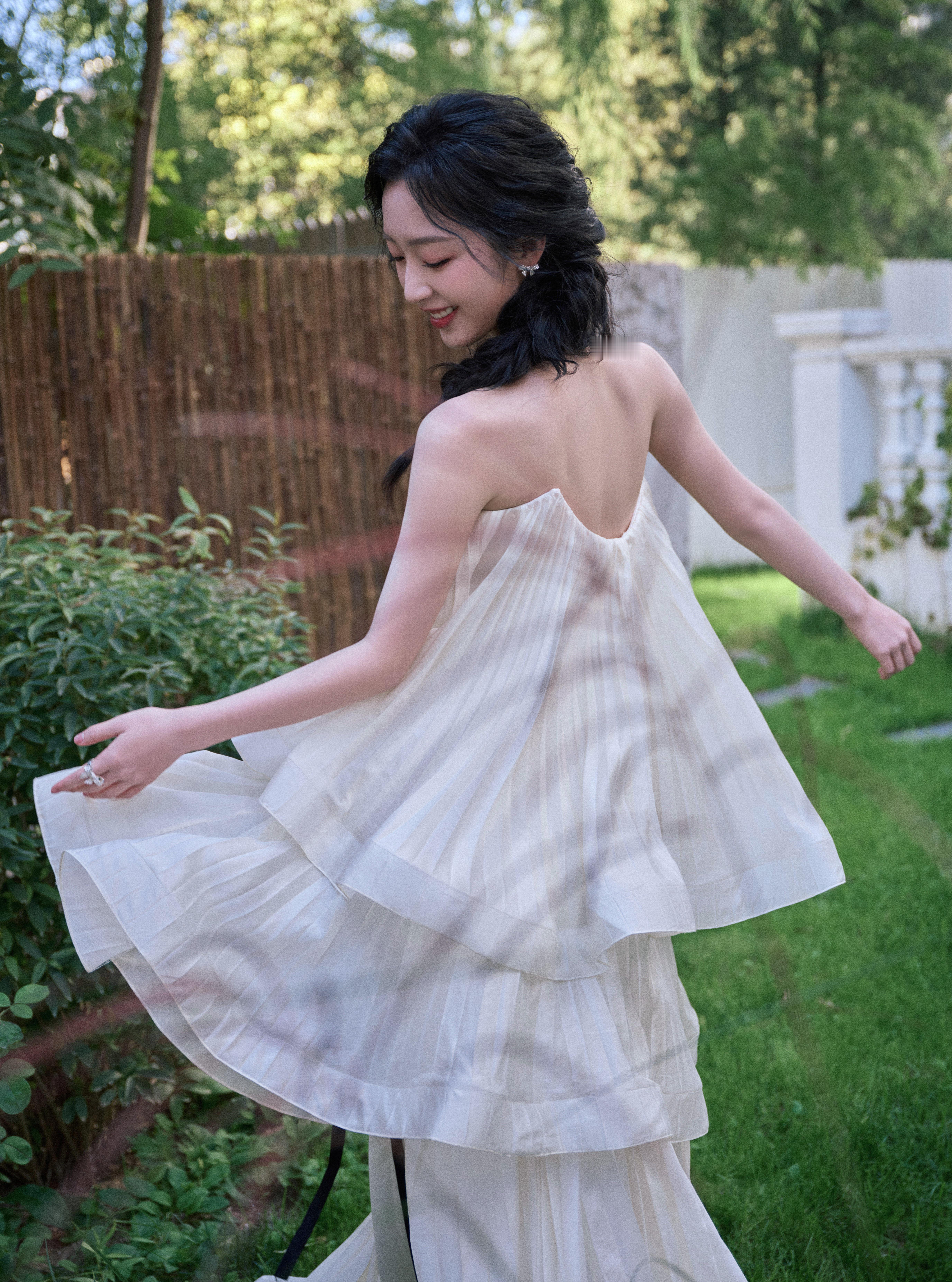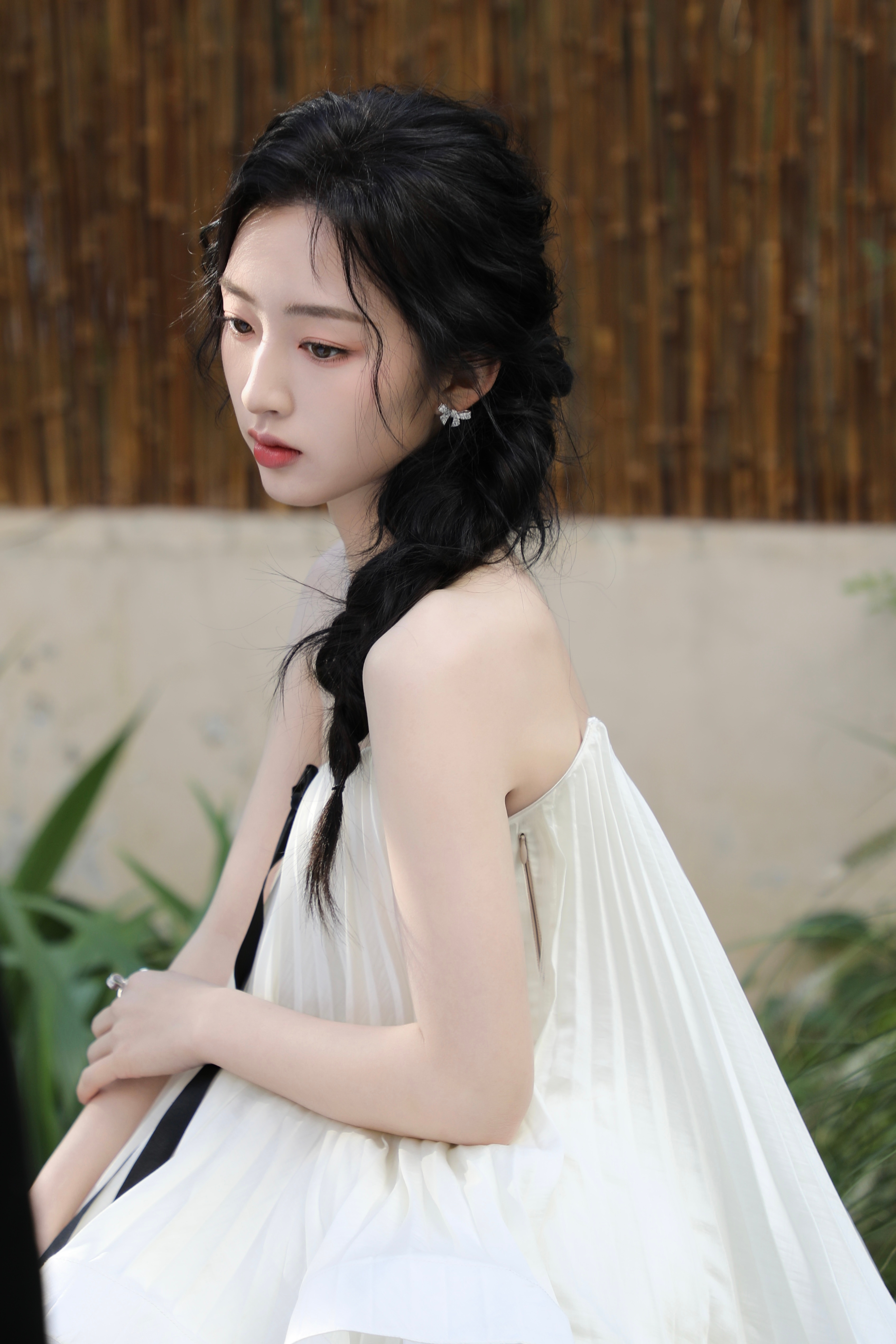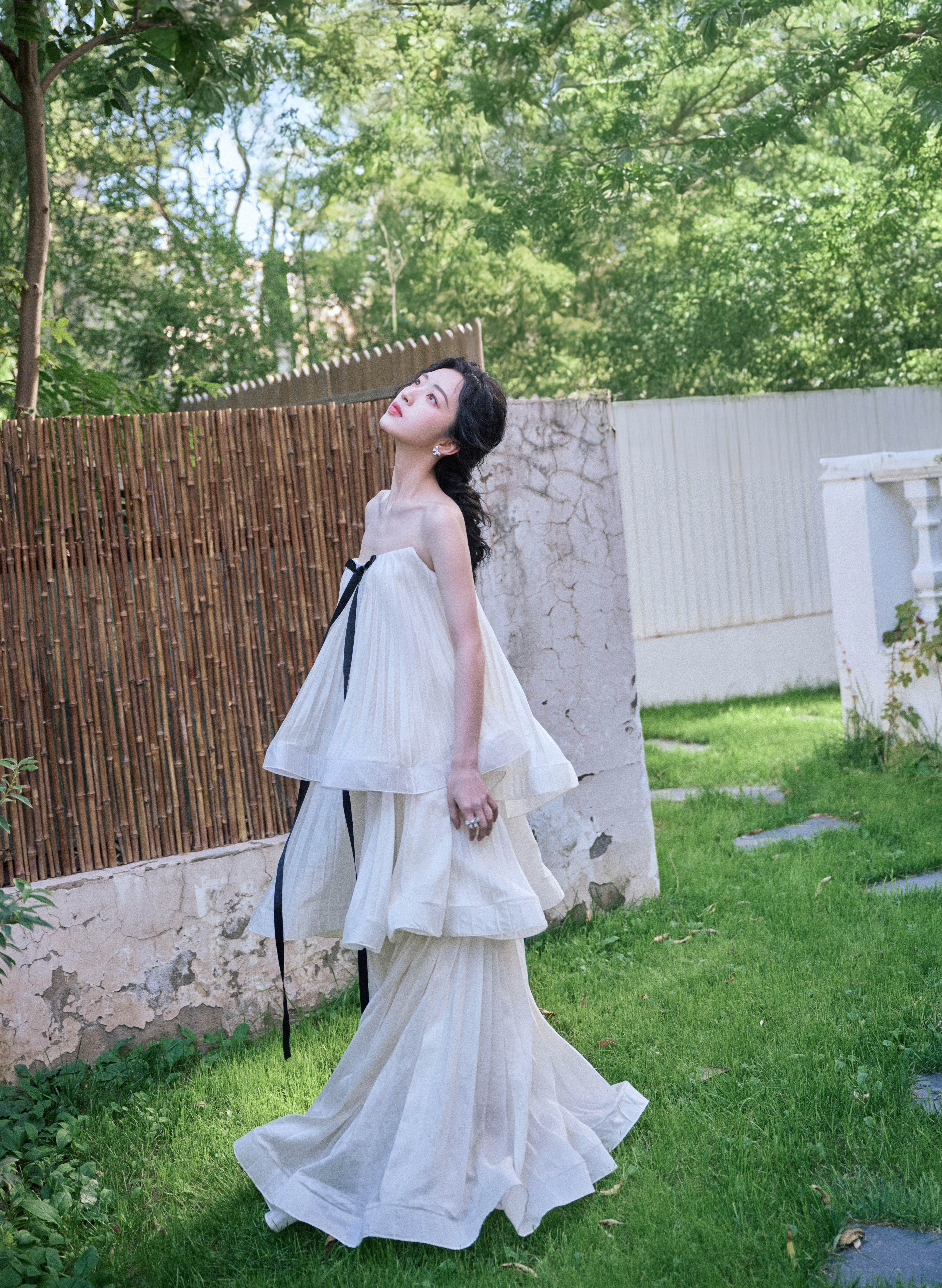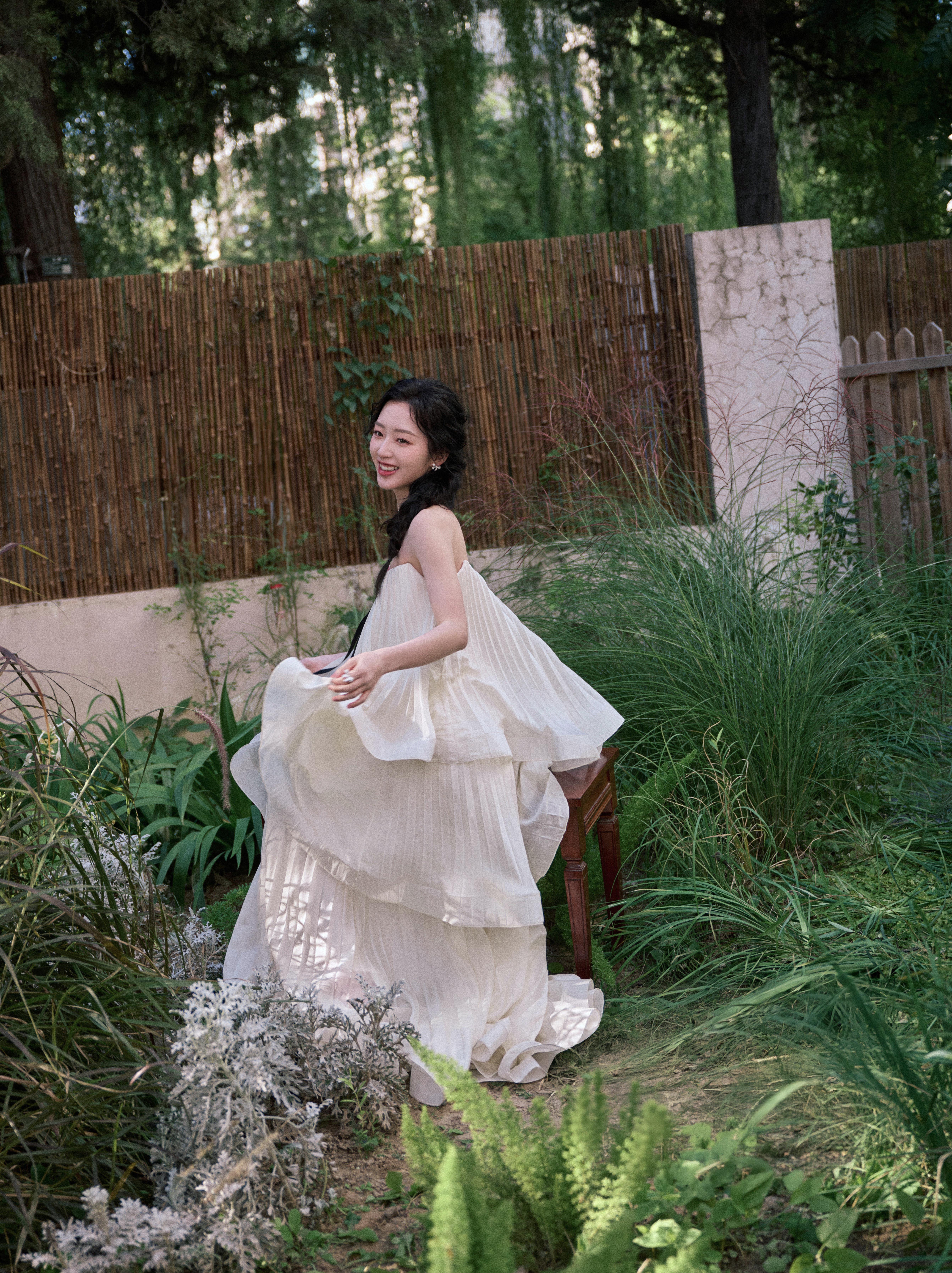邓恩熙 黑蝴蝶结在白裙间轻缀,麻花辫挽起温柔,她似从复古梦境中走来,于光影里漾开雅致风情。邓恩熙elle红毯生图
