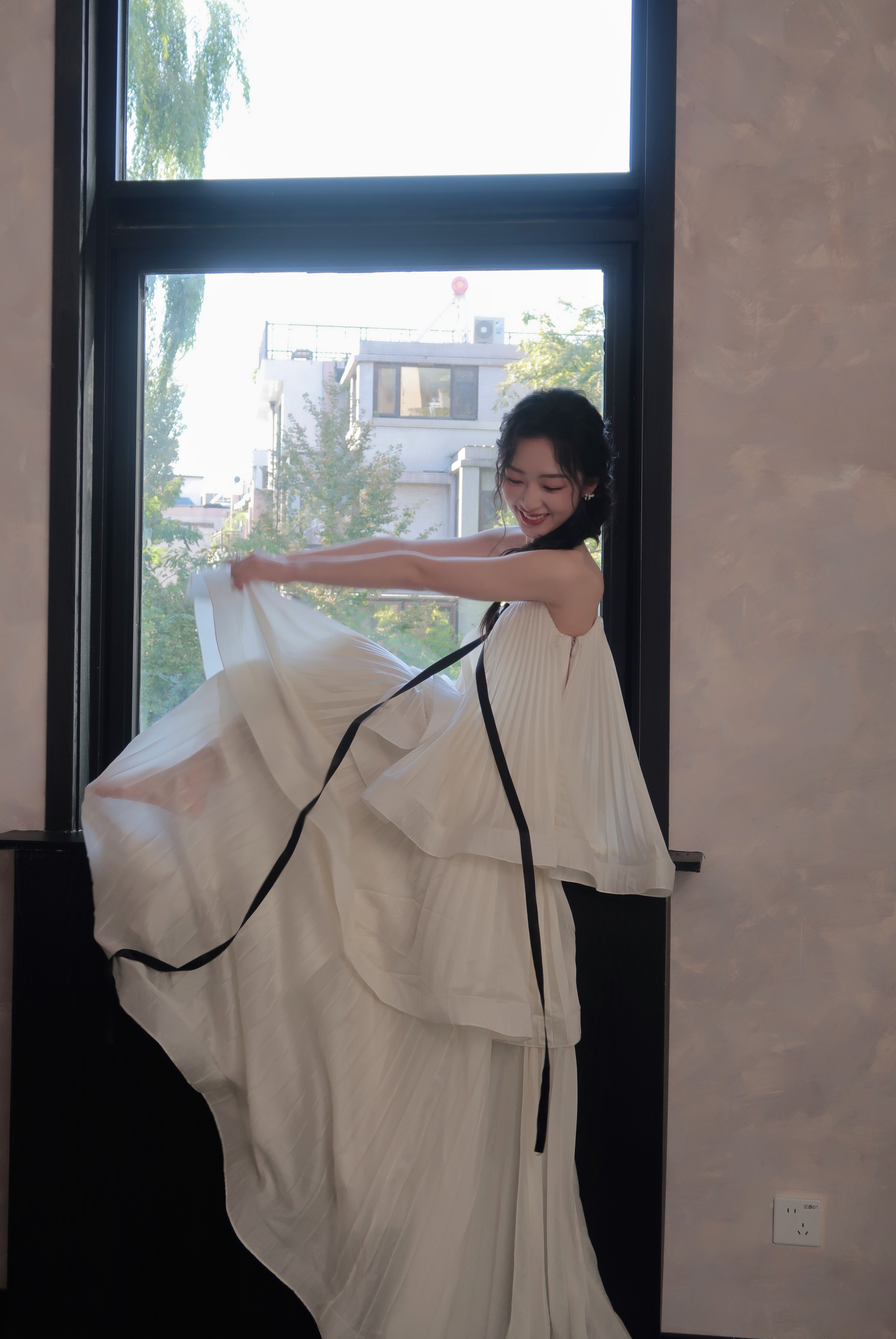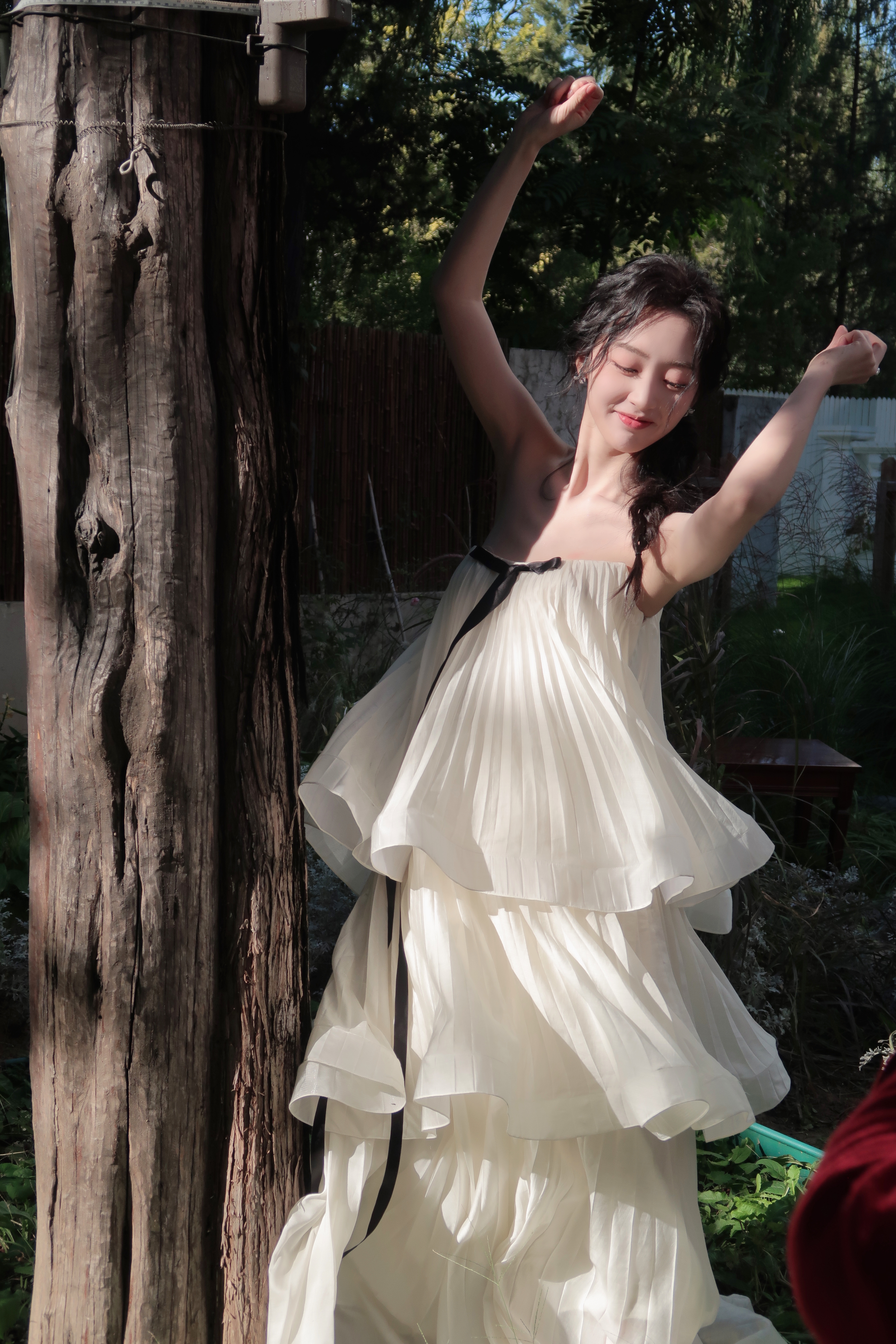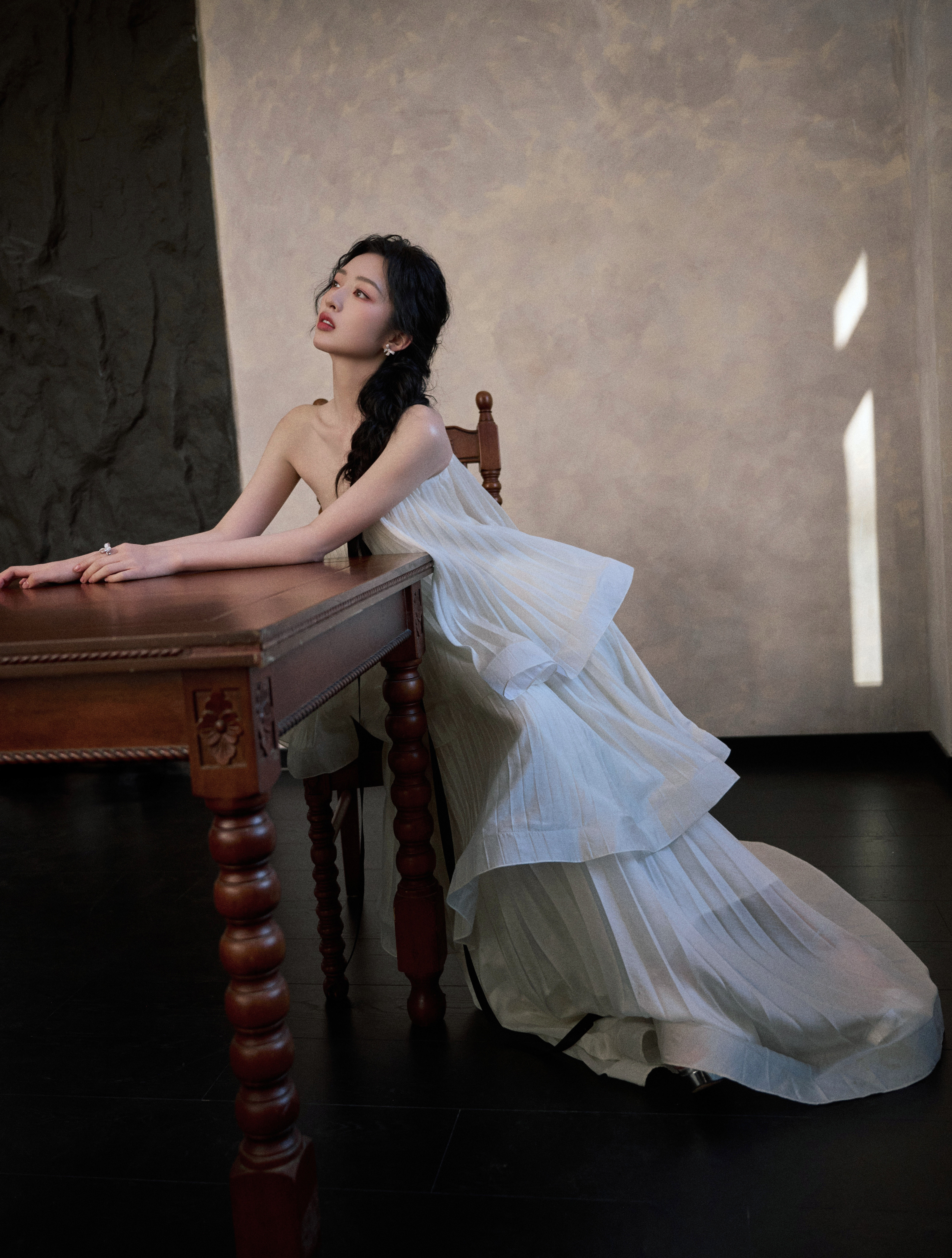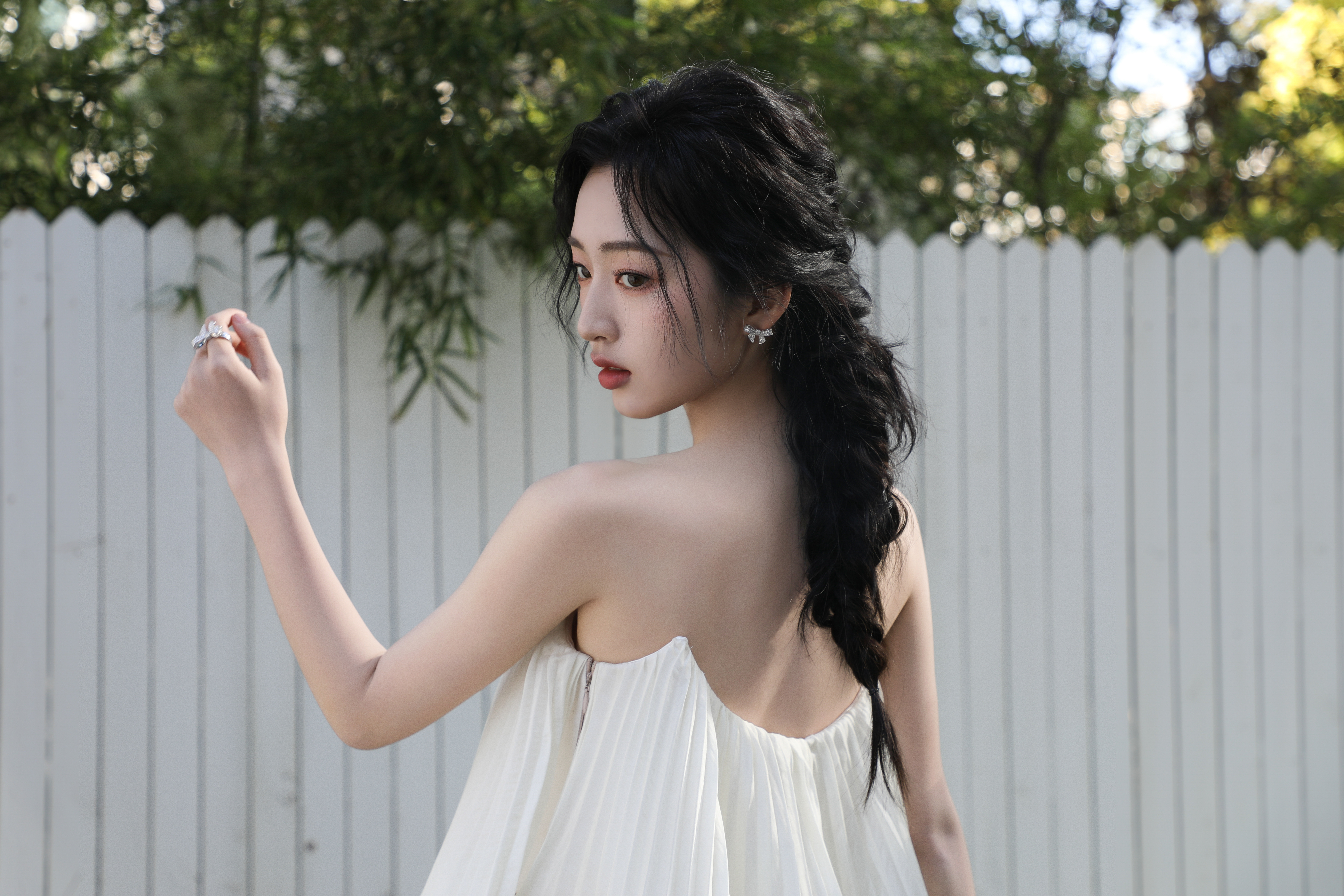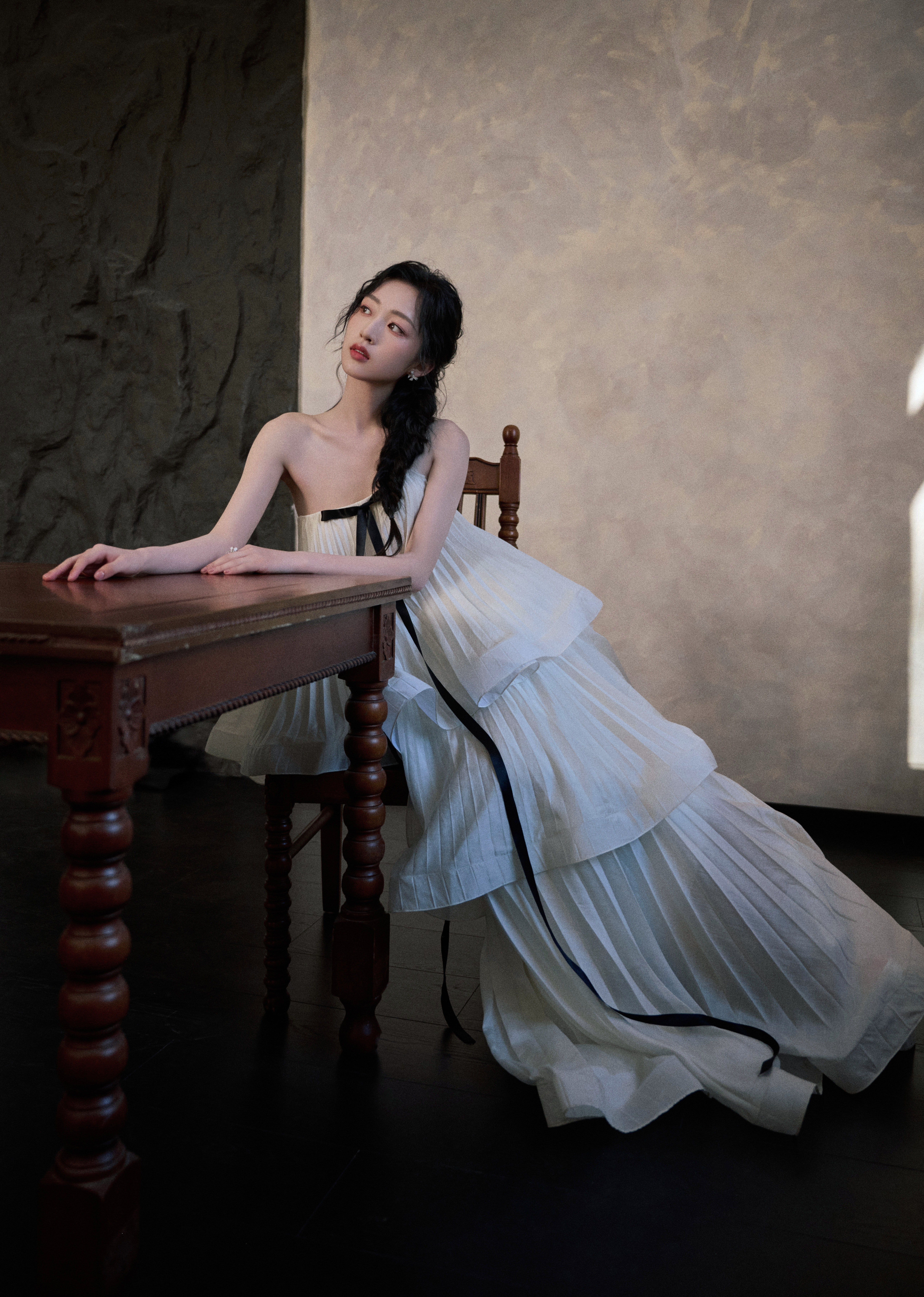 邓恩熙 黑蝴蝶结在白裙间轻缀,麻花辫挽起温柔,她似从复古梦境中走来,于光影里漾开雅致风情。邓恩熙elle红毯生图