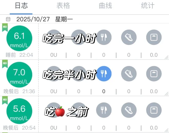 最近爱上了王林苹果,真是太好吃了。昨天睡前测出个7.2,我就觉得这个苹果不简单。今天空腹吃了120克,测了半小时和一小时的血糖,好家伙半小时7.0一小时6.1[石化R] 我吃一斤多西瓜都达不到7.0[失望R]