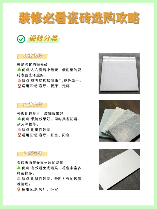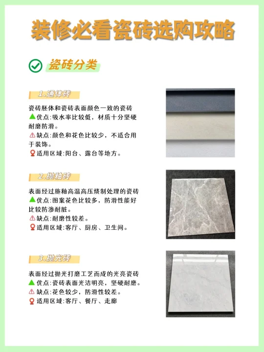 3️⃣检查釉面:仔细看瓷砖釉面,优质瓷砖釉面均匀、光滑,没有斑点、气泡等瑕疵