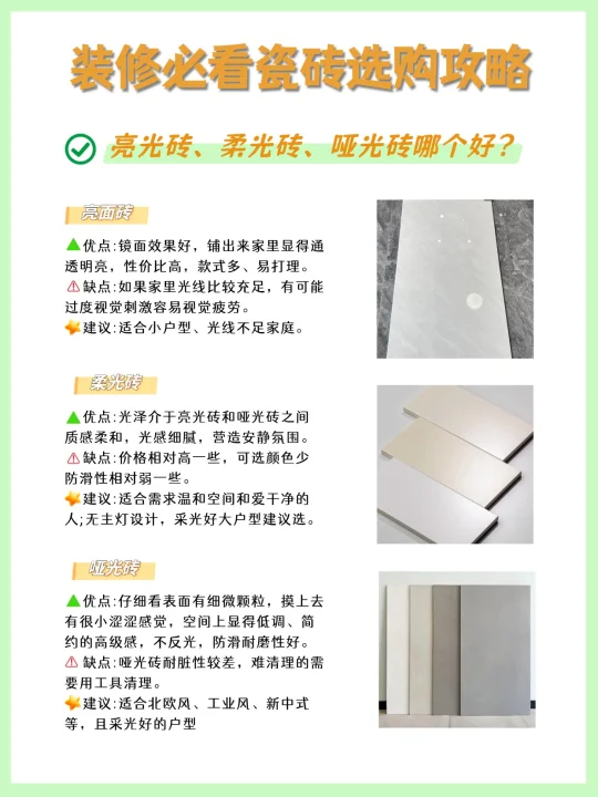 三种光泽的瓷砖各有优势,要根据家里的户型和采光选: