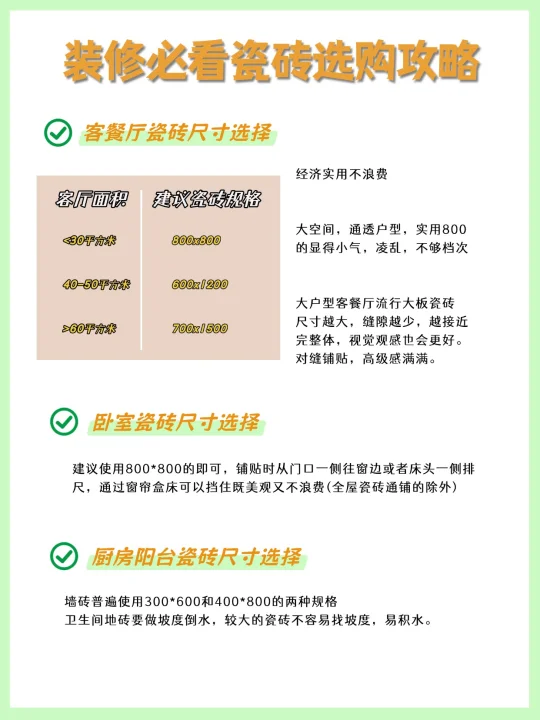 ✅厨房和阳台:墙砖常用的是 300*600mm 和 400*800mm 两种规格。卫生间地砖要做排水坡度,要是用太大的瓷砖,不容易找坡度,很容易积水,这点要注意