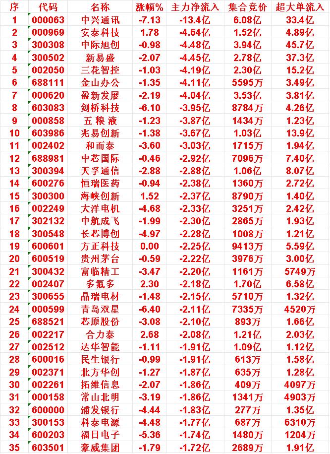 10月29日开盘45分钟,主力资金“卖出的 ”35名单! 中兴通讯:主力净流出 13.4亿元 安泰科技:主力净流出 4.64亿元 中际旭创:主力净流出 4.48亿元 新易盛:主力净流出 4.45亿元 三花智控:主力净流出 4.19亿元