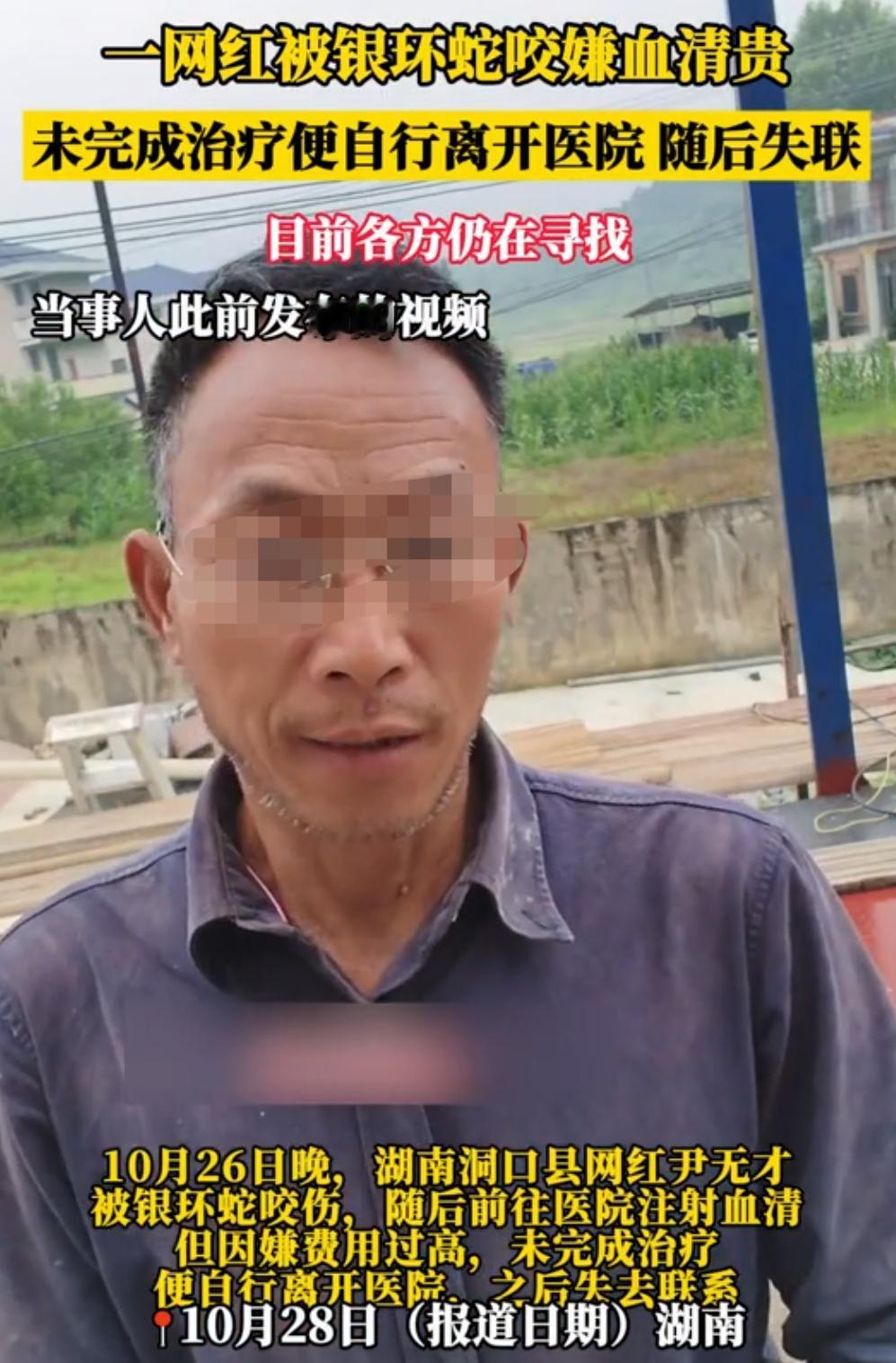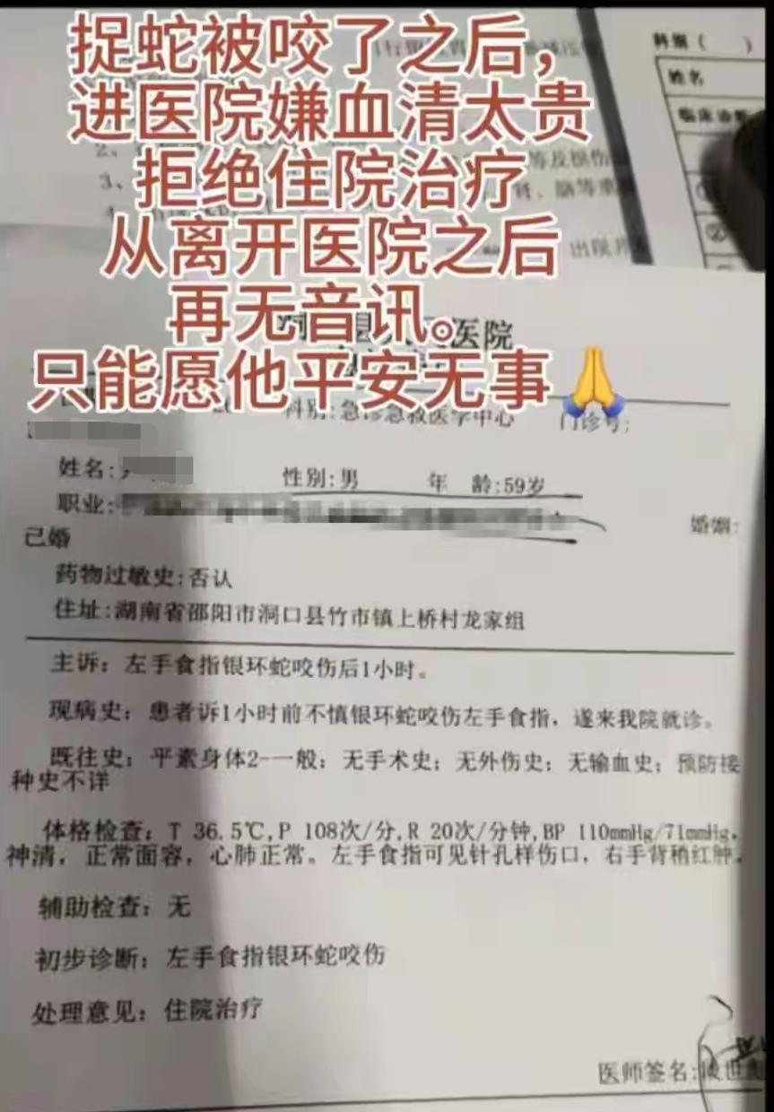 这位湖南的网红大叔是个狠人! 户外直播抓蛇,被银环蛇咬到食指,去医院检查后要打血清,大叔嫌收费贵,直接开车走了,手机关机。 关键是他独居,家属都在外地,他没和任何人说,还是他的一个朋友发现他从医院走了,告诉了家属报了警。 据医院方说,血清按标准收费1400元一针,要打两针,再用新农合报销一部分,实际个人仅需付1千多。 对此,有网友说,大叔被毒蛇咬了都没被吓到,却被医院的收费吓到了。 也有网友说,被银环蛇咬后48小时不打血清会有生命危险,大叔此举有恶意炒作引流之嫌。 当前48小时已过,大叔已回家和家人团聚,据他说,经常和蛇打交道,随身带的有草药,也知道一些治疗蛇毒的土方法,离开医院就是去山里找草药。 人命关天的事万不能开玩笑,要相信科学,蛇可以失误无数次,而人一次都不可以,好在大叔当前无事,不得不佩服他艺高人胆大! 抓蛇大叔 徒手抓毒蛇