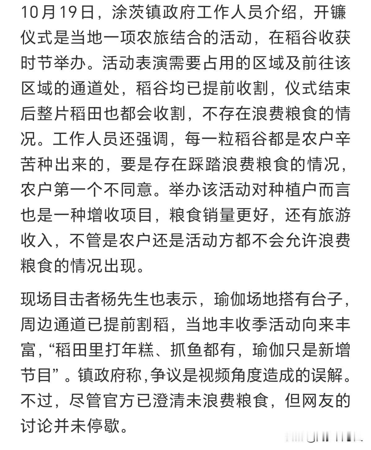 反复观看了几遍,官方澄清的没有错!稻田表演瑜伽的女孩确实是没有踩踏稻田,浪费粮食。 从网上拍视频的人角度来看,那些在稻田表演瑜伽的女子,她们四周的稻穗都是站立着,因此网友们觉得瑜伽垫下面的稻谷已经被压毁了,这是在浪费粮食! 但从镇里的工作人员说的话,可以看出来,其实瑜伽垫下面的稻谷已经收割了,提前收割了一片空地,才让女孩们走进去在那表演瑜伽。 虽然在稻田里让一些女孩子在那表演瑜伽,我也觉得看起来不伦不类的,毫无美感!但要说毁稻田浪费粮食,那确实是冤枉了活动举办方。 相信活动举办方也会给稻田种植户,一笔场地租赁费用。