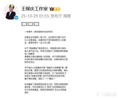 王耀庆工作室深夜发长文发声王耀庆工作室在深夜发长文为舅舅发声!说“以后不做活动直播间主持人啦。不好玩,不背锅。”澄清表达的不是那个意思,是因为临时调整吃了“螺丝”。也希望这场“网络狂欢”顺利谢幕。