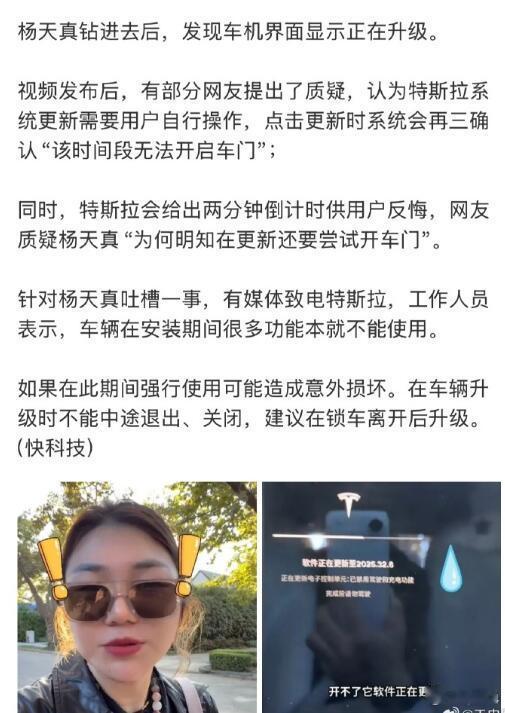 昨天杨天真吐槽“特斯拉升级期间打不开车门”的事情,有后续了!有人质询了特斯拉,工作人员的回复是,“车辆在安装期间,很多功能本就不能使用,如果强行使用可能造成意外损坏,建议在锁车离开之后再进行升级”。