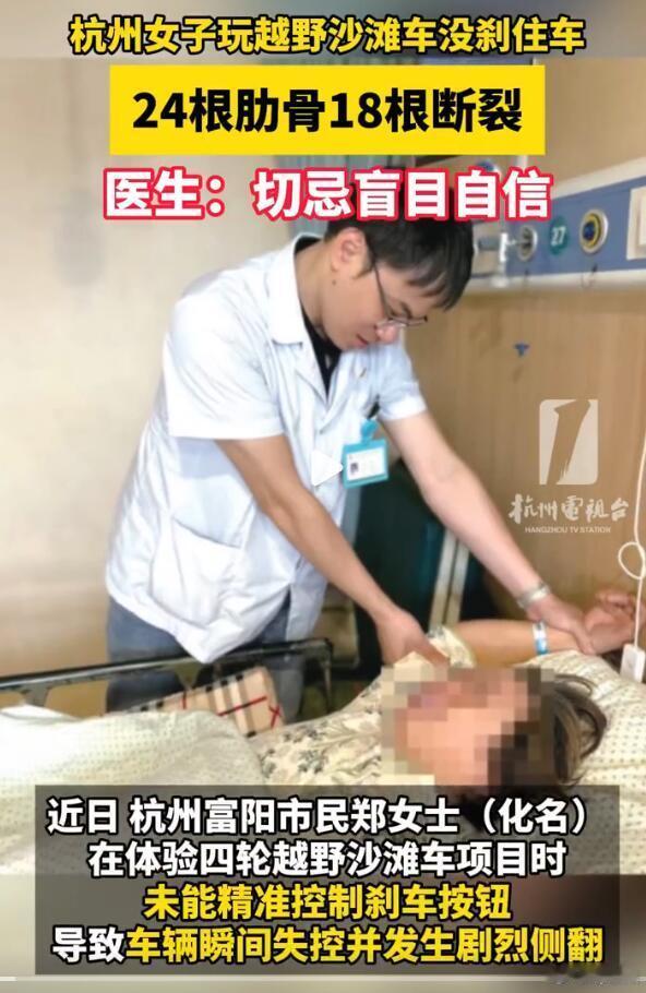 像这个事件里,当事人的胸部撞击在方向盘上,很有可能就是安全带不合规的原因。那么大家在玩这类娱乐项目的时候,事先也得注意一下了~杭州女子玩越野车18根肋骨断裂