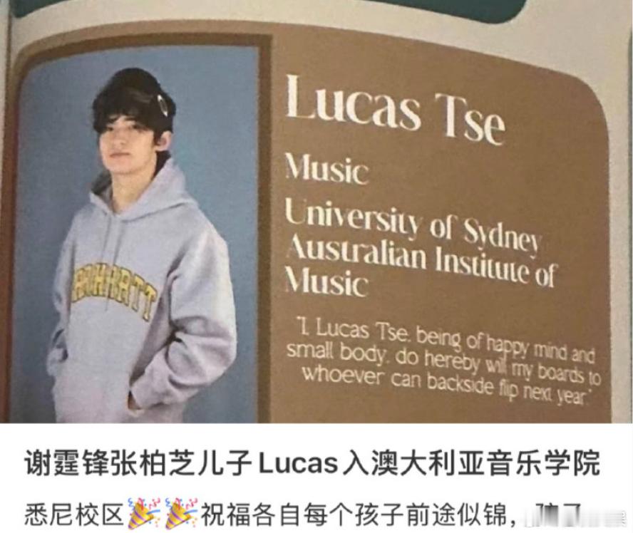 澳大利亚音乐学院录取了谢霆锋张柏芝的大儿子,他通过自身努力,为自己的音乐兴趣争取到专业学习的机会。谢霆锋张柏芝大儿子考入澳大利亚音乐学院谢霆锋张柏芝大儿子学音乐了