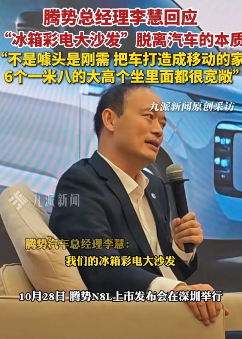 王传福把李慧替代赵长江腾势总经理这个举动,没有下错。李慧回应媒体的提问回答的一愣一愣的。他坐着回答说:“冰箱彩电大沙发”脱离汽车的本质,不是噱头是刚需,把车打造成移动的家,6个一米八的大高个坐里面都很宽敞,这就是腾势N8L的空间优势。 腾势N8L配备了-6℃至50℃双温区冰箱,位于副驾后方,容积12L,支持手机APP远程控制。实测中,从25℃环境降温至0℃仅需18分钟,且采用压缩机制冷,噪音仅38分贝,表现优于理想L8的半导体冰箱。在彩电方面,17.3英寸后排吸顶屏支持4K分辨率与HDR10+,配合22扬声器的帝瓦雷音响,可实现7.1.4声道环绕声,还增加了手势控制与AR - HUD联动功能。把理想那套冰箱彩电大沙发学的极致,问题是比理想L8便宜2.2万元,同样是国产新能源高端品牌,大家觉得谁适合入手呢?