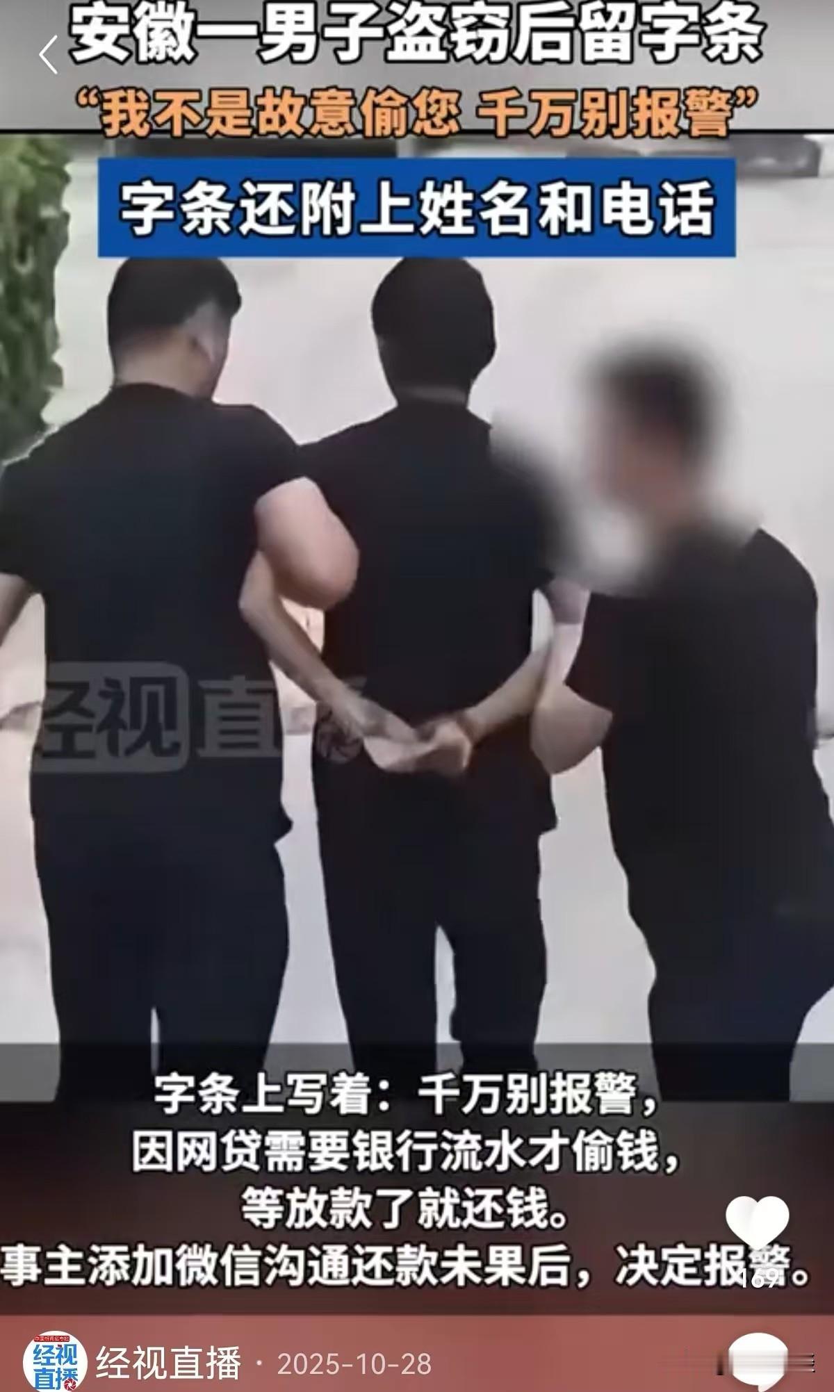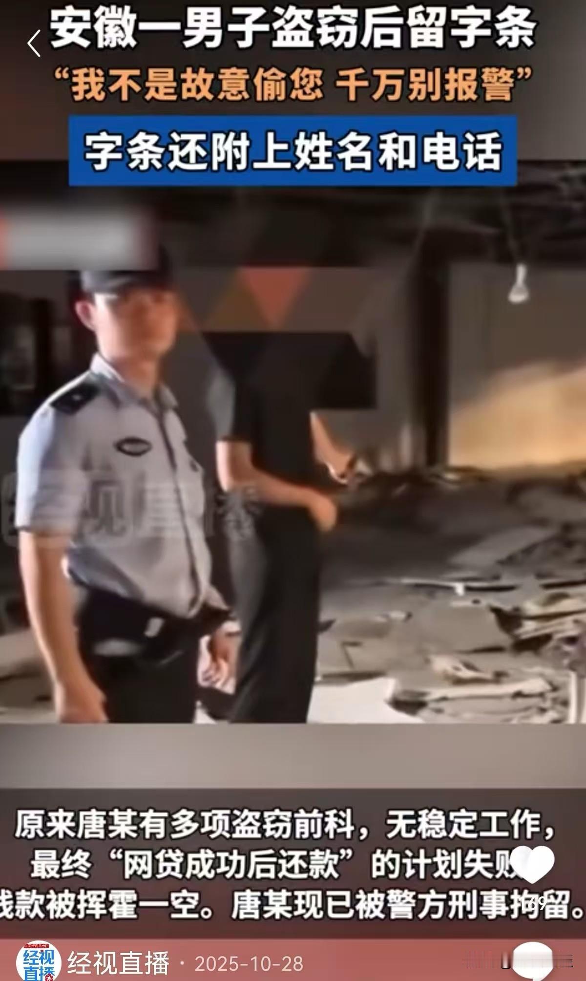 安徽芜湖,男子放在办公室的数千元现金被盗,他正要报警发现盗贼留有一纸条。上面写着:千万别报警,因网贷需要银行流水才偷钱,等放款了就还钱。并留下姓名和手机号码,让加微信联系。男子很诧异,加了微信想试试真假,结果是真的。与其沟通还钱未果后,一怒报警。盗贼弄巧成拙,结局亮了! 王先生是一家公司的职员,那天早上他像往常一样去办公室上班,一打开抽屉就傻了眼,里面准备用来支付货款的几千块现金不翼而飞了。 王先生又急又气,正琢磨着是不是办公室进了小偷,要报警时,发现在抽屉角落有一张折叠的纸条。 他展开纸条一看,更是丈二和尚摸不着头脑。 纸条上字迹歪歪扭扭地写着:千万别报警!我是因为网贷需要做银行流水才出此下策,等网贷放款了,肯定把钱还你。 更离谱的是,纸条末尾不仅清清楚楚写着姓名和手机号码,并备注着加微信联系! 见过嚣张的窃贼,却没见过这么‘实诚’的! 王先生拿着这张注明肺腑之言的纸条,又好气又好笑。 他琢磨着,这要么是窃贼的恶作剧,故意留假信息误导警方;要么就是这人脑子不太灵光,真以为留个名字电话,事主就会乖乖不报警。 抱着试试看的心态,王先生按照纸条上的号码添加了微信,对方很快通过了验证,微信名和纸条上的姓名一致,正是唐某。 添加好友后,王先生和唐某沟通还款事宜,唐某一开始态度挺好,反复保证“就这几天,网贷一到账马上转钱,还一个劲儿道歉,说自己也是走投无路才这么做。 可王先生多次催要还款沟通无果后,他觉得事情并没那么简单,于是,他拨打了报警电话。 民警也是觉得新鲜,从事多年刑侦工作,还是第一次遇到盗窃后主动留真名实姓和联系方式的窃贼。 一开始大家都猜测,这大概率是障眼法,纸条上的信息说不定都是伪造的,目的就是让事主放松警惕,拖延报警时间。 可没想到,民警通过系统核查后发现,纸条上的姓名和手机号码都是真实的,机主唐某确实存在,而且还有多次盗窃前科。 这个发现让办案民警都觉得意外,既然有前科,按理说应该更懂如何躲避警方追查,怎么会主动留下关键信息呢? 带着这个疑问,民警通过王师傅提供的微信,尝试联系唐某。 民警伪装成王师傅的朋友,在微信上跟唐某说“愿意再宽限几天,但想当面聊聊还款细节”。 唐某大概是还抱着蒙混过关的想法,没多想就答应了,还主动约定了见面地点。 等唐某按时赴约,刚一出现就被早已埋伏在周围的民警当场抓获。 唐某面对民警的讯问,倒是没怎么抵抗,一五一十交代了自己的作案经过。 原来唐某一直没有稳定工作,之前因为盗窃多次入狱,出来后还是好吃懒做,没想着正经谋生。 后来他听说网贷要看银行流水才能放款,就动了歪心思,想着先偷点钱存进银行,制造资金往来的假象,等网贷批下来,再把偷来的钱还回去,这样既拿到了网贷,又不用担盗窃的罪名。 他说怕再被抓进去,想着网贷下来就还钱,谁知道网贷没批下来,偷来的钱也花光了! 唐某说起自己的如意算盘,还一脸委屈,仿佛自己只是暂时借了钱,不是盗窃。 可他忘了,不管初衷是什么,偷偷拿走别人的财物,就已经构成了盗窃行为。 民警了解到,唐某盗窃得手后,确实把部分钱存进了银行,试图制造流水,但网贷平台审核远比他想象的严格,不仅要看流水,还要核查收入证明、征信记录等多项信息,他的申请自然没能通过。 而那些偷来的钱,被他用来吃喝玩乐,没几天就挥霍一空,面对王师傅的催款,他也只能百般拖延。 目前,唐某因涉嫌多次盗窃,已被警方依法刑事拘留,案件还在进一步办理中。 有人说,这大概是史上最‘讲信用’的窃贼,就是脑子不太够用! 还有人说:以为留个名字电话就能规避法律,真是把盗窃当成借钱了,太天真了。 《刑法》第264条 规定:盗窃公私财物,数额较大的,或者多次盗窃、入户盗窃、携带凶器盗窃、扒窃的,处3年以下有期徒刑、拘役或者管制,并处或者单处罚金…… 唐某存在多次盗窃前科,此次又实施盗窃行为,符合“多次盗窃”的情形。 “多次盗窃”并不要求每次盗窃的财物数额达到较大标准,只要在一定时间内多次实施盗窃行为即可认定为盗窃罪。 唐某的行为侵犯了他人对公私财物的所有权,破坏了社会秩序,依据上述法律条文,其行为构成盗窃罪,应当受到相应的刑事处罚。 《刑法》第193条规定:以非法占有为目的,诈骗银行或者其他金融机构的贷款,数额较大的,处5年以下有期徒刑或者拘役,并处2万元以上20万元以下罚金;…… 唐某用盗窃所得的赃款制造“银行流水”以套取网贷,其目的是非法占有金融机构的贷款。 如果唐某是以非法占有为目的,通过这种虚假手段骗取银行或其他金融机构贷款,且数额达到较大标准,其行为符合贷款诈骗罪的构成要件,应按照贷款诈骗罪定罪处罚。 唐某走歪门邪道,自作聪明,却弄巧成拙,最终只能是自食恶果! 您对唐某的行为怎么看?