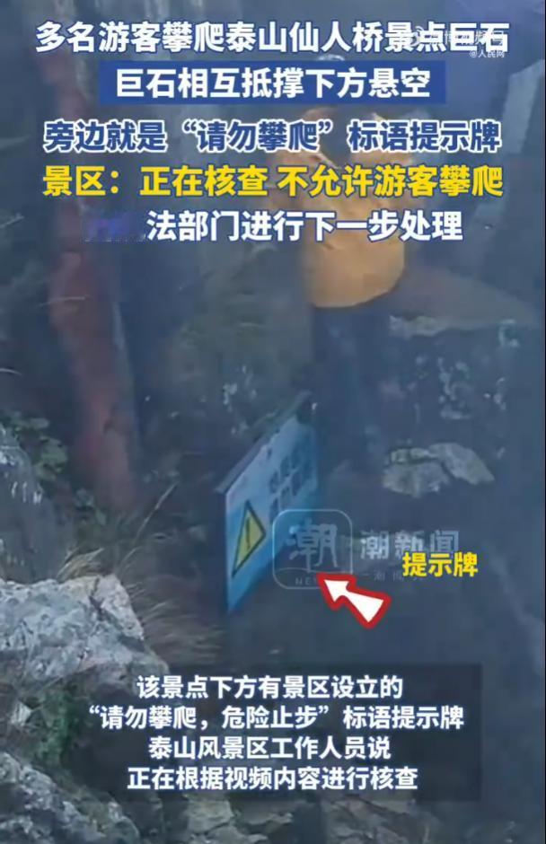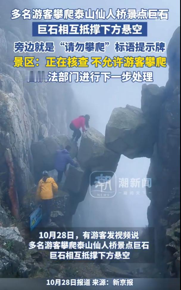 “让人捏了把汗!”10月28日,山东泰山,三名游客翻越护栏爬上泰山仙人桥巨石的视频引发关注,画面中他们站在悬空巨石上拍照,脚下是深邃山谷,景区:已介入调查,将依法依规处理。[得意] 泰山仙人桥由三块巨石天然构成横跨峭壁的桥状结构,攀爬未开放区域明确违规,现场设有醒目警示牌,但仍有游客冒险突破防线。 去年一名游客在黄山未开发区域坠崖,救援人员耗费十余小时才完成搜救,今年夏天八达岭长城一名游客在城墙刻字,最终被处以罚款并列入旅游黑名单。 游客违反安全规定造成的人身损害需自行担责,若破坏景观还需承担修复赔偿,2020年一名游客在贵州梵净山攀登金顶时滑坠,不仅身受重伤,还被景区追索救援费用。 景区管理面临实际挑战,单纯增设护栏可能影响景观完整性,而巡查人力终究有限,部分景区开始尝试智能监控系统,通过AI识别危险行为并实时语音提醒。 一些游客还会专门寻找“隐藏机位”,甚至互相分享躲避巡查的技巧,这种追求独特照片的心态,让他们低估了潜在风险。 泰山仙人桥这类自然岩体长期受风化作用,承重能力难以评估,去年就曾发生过游客在类似地质结构上拍照导致碎石滑落的事件。 多位旅游博主开始在社交平台分享安全拍照指南,建议游客选择景区推荐的观景平台,这些平台经过安全评估,同样能拍出精彩照片。 看了这个新闻,真是让人捏把汗又忍不住想吐槽,网友们的评论也是五花八门。 “这要是一脚踩滑了,后果想都不敢想,这不光是拿自己的命开玩笑,出了事还得连累救援人员去冒险,太自私了!” “这种无视明确警示、纯属作死的行为,不仅不值得同情,如果真的发生意外,责任也应该完全由自己承担。” “光批评教育没用,必须得罚,景区应该把他们列入游客黑名单,几年内禁止进入全国所有重点景区。” “光核查不行,得找到人重重罚一笔,才能以儆效尤。” “只有让违规者付出实实在在的代价,才能有效震慑后来者。” “除了罚,景区管理是不是也能再升级?比如在这种特别危险的地方,能不能安装一旦有人越过警示线就会自动大声警报的装置?或者加强巡逻频率。” “再好的硬件也防不住作死的心,关键还是得靠自觉。” “这哪是去旅游的,这是去给景区增加KPI的。” “他们可能觉得这样拍照特别帅,但在别人眼里,这行为真的挺幼稚的。” “真正的勇者不是敢于冒险的人,而是那些对自然怀有敬畏、对规则心存尊重、对自己和他人生命负责的人。” 如果你当时在现场,亲眼看到有人爬上去,你会怎么做?是选择立刻大声劝阻,还是默默走开然后向景区工作人员报告? 一起来评论区聊聊你的看法和经历吧! 信源:人民网