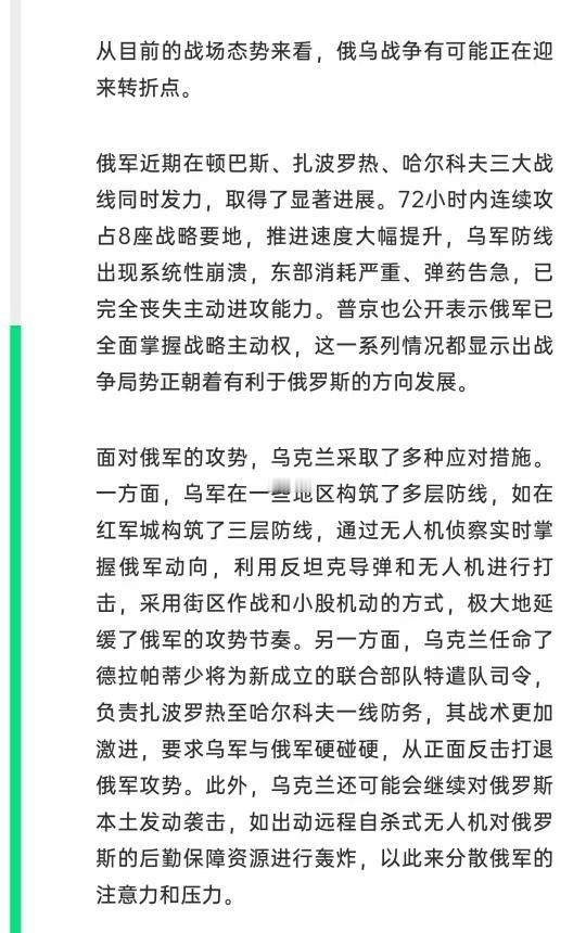 俄乌转折点来了? 俄军在顿巴斯、扎波罗热、哈尔科夫三大战线取得显著进展,推进速度大幅提升,乌军防线崩溃。乌克兰采取多层防线和激进战术延缓攻势,但西方援助减少,装备短缺,乌军对西方援助信心存疑。