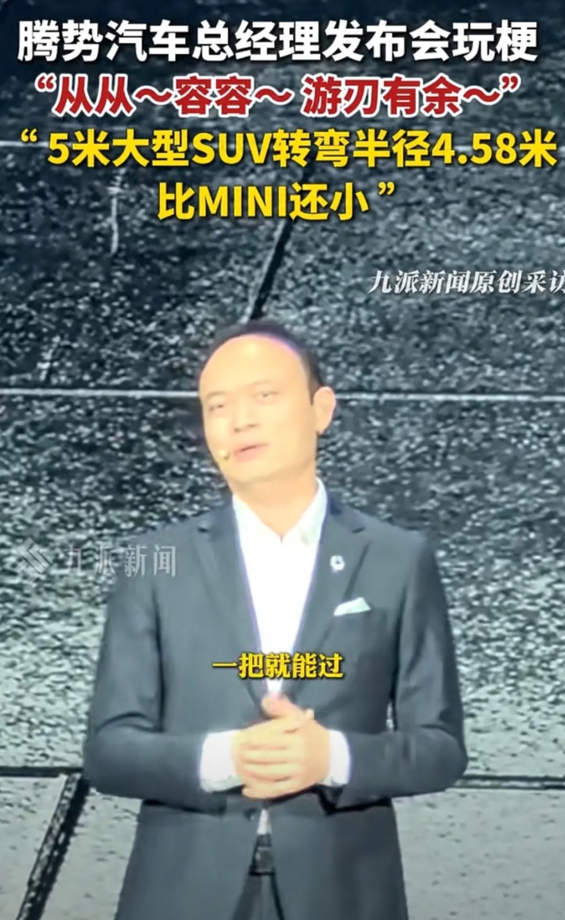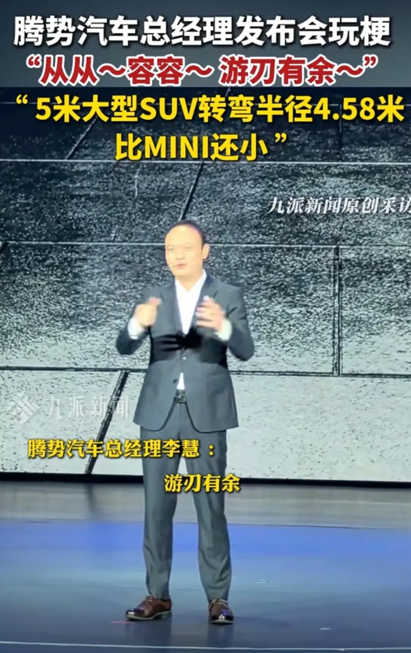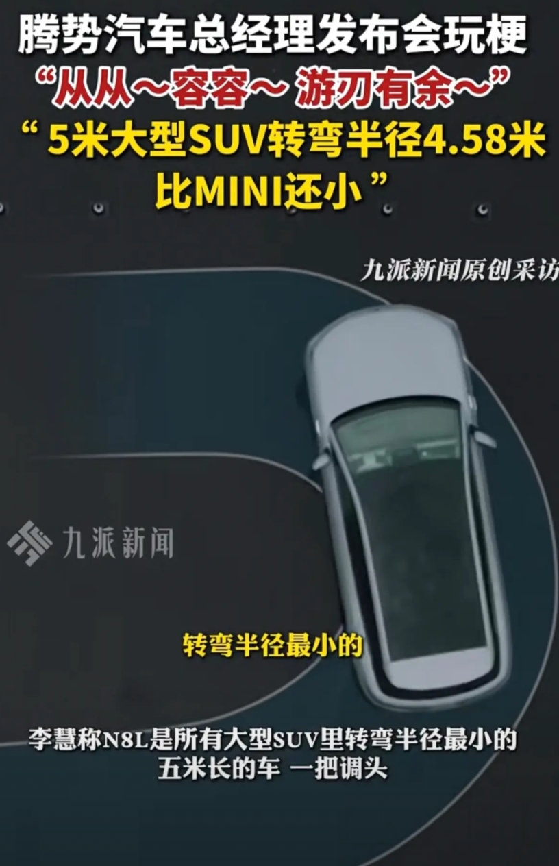 比亚迪的发布会跟其他新势力就是不一样,不吹嘘,不夸张宣传,有一说一。腾势总经理李慧在N8L的发布会上说的很开心,玩梗归玩梗,可是说的都是大实话。他说:从从容容,游刃有余,5米大型SUV转弯半径4.58米 比宝马MINI还小,转弯一把过就是这么轻松。 腾势N8L搭配的易三方平台的后轮双电机独立转向技术,全系标配正负10°的后轮转向系统,转弯半径只有4.58米,比宝马MINI还要小,灵活性比肩A0级小车,能够让驾驶者在驾驶过程中从从容容,游刃有余 。就是这么高端的配置才29.98万起,友商会怎么想,理想L8和余承东的问界M8怕了吗?