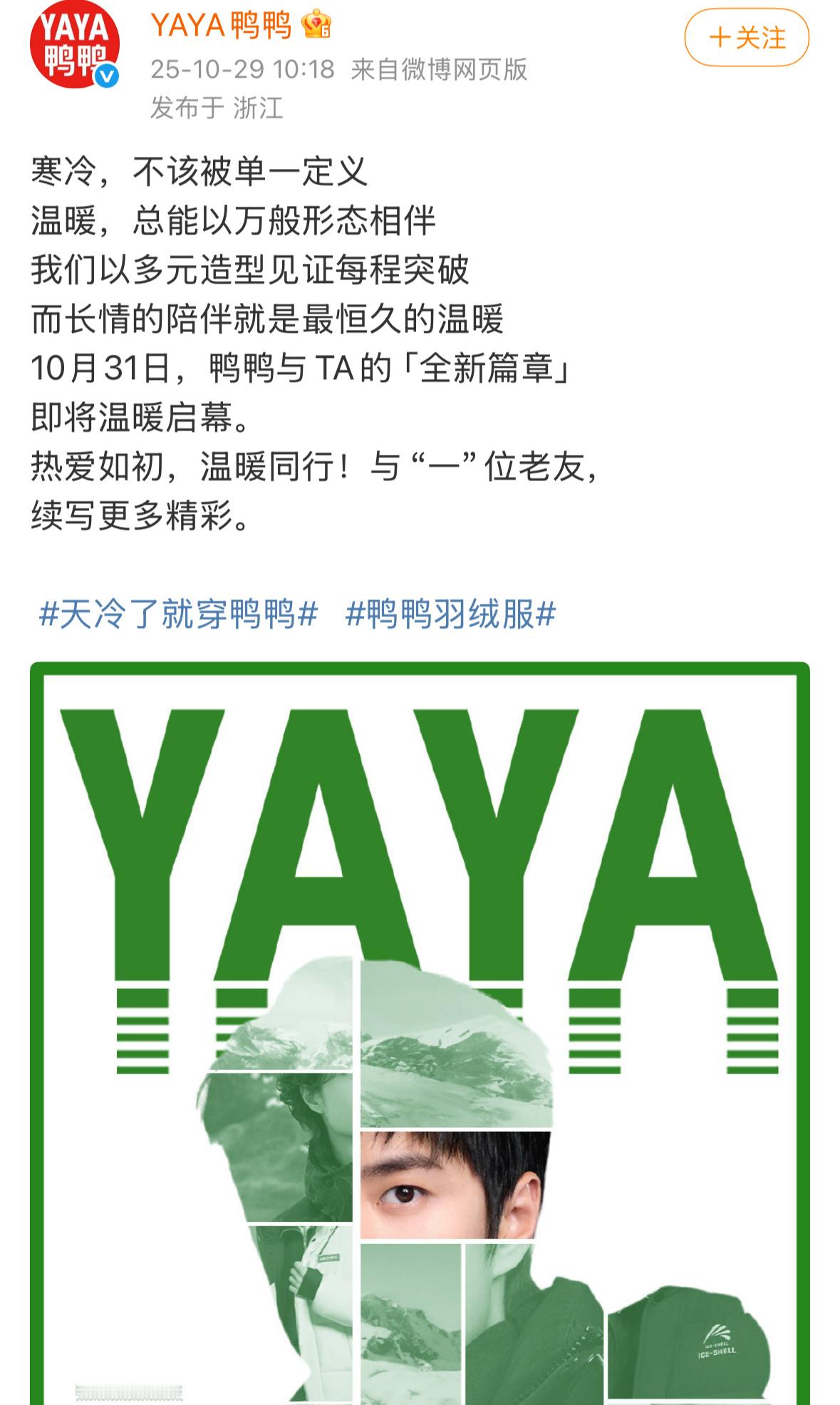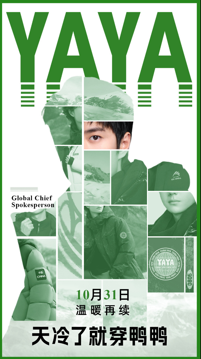 天冷了穿鸭鸭,鸭鸭全球首席代言人王一博。鸭鸭代言人还有赵露思 梓渝 鞠婧祎 陈哲远等等吧
