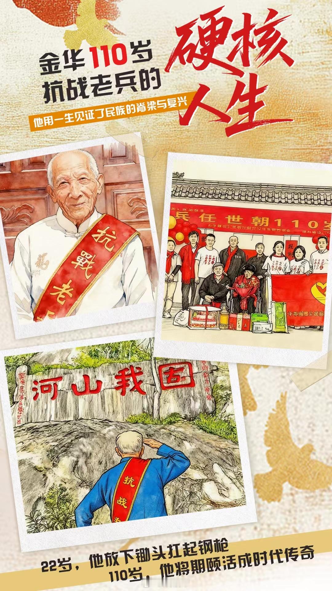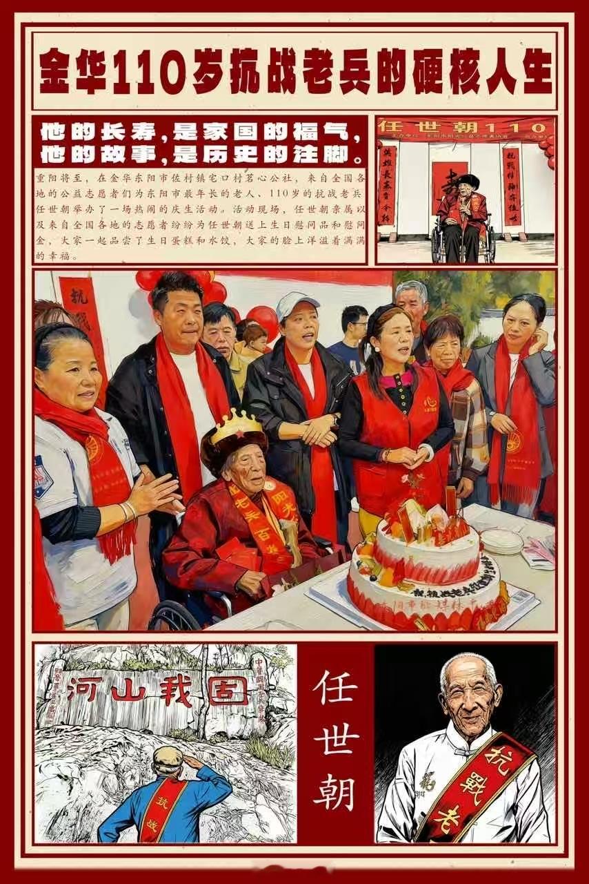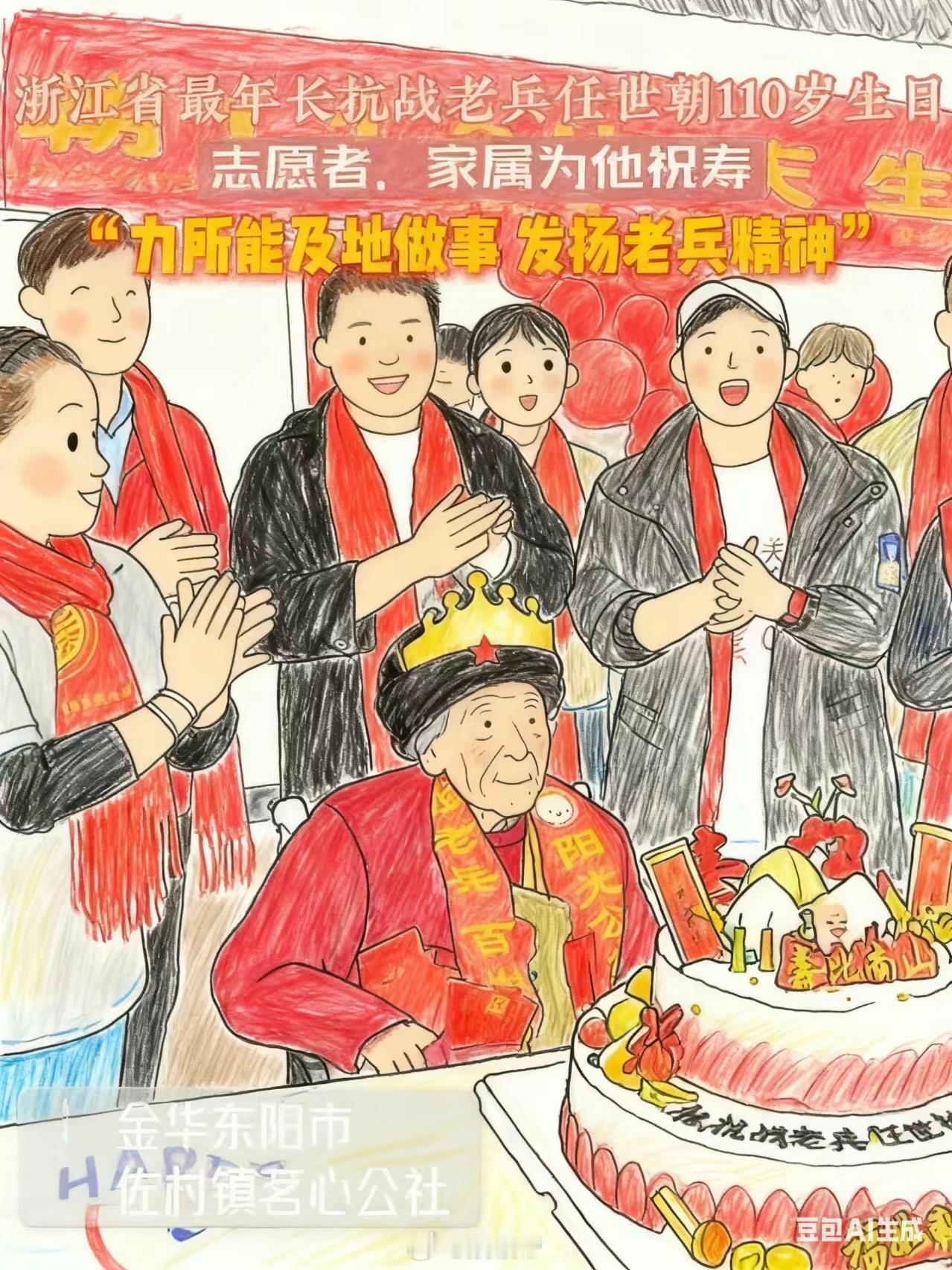 【浙江最年长抗战老兵迎110岁生日】近日,浙江金华。1916年出生,22岁投身抗战,亲历民族危亡与复兴——浙江最长寿的抗战老兵任世朝爷爷的110岁,是一部浓缩的家国史。庆生现场,家属、社会各界爱心人士等200余人为老人庆生,唱生日歌、送鲜花、喂蛋糕......。儿子说:“父亲还是力所及能地做一些事情,发扬老兵精神”。致敬英雄,铭记历史,祝福任老!八婺同心(视频来源:东阳市融媒体中心)