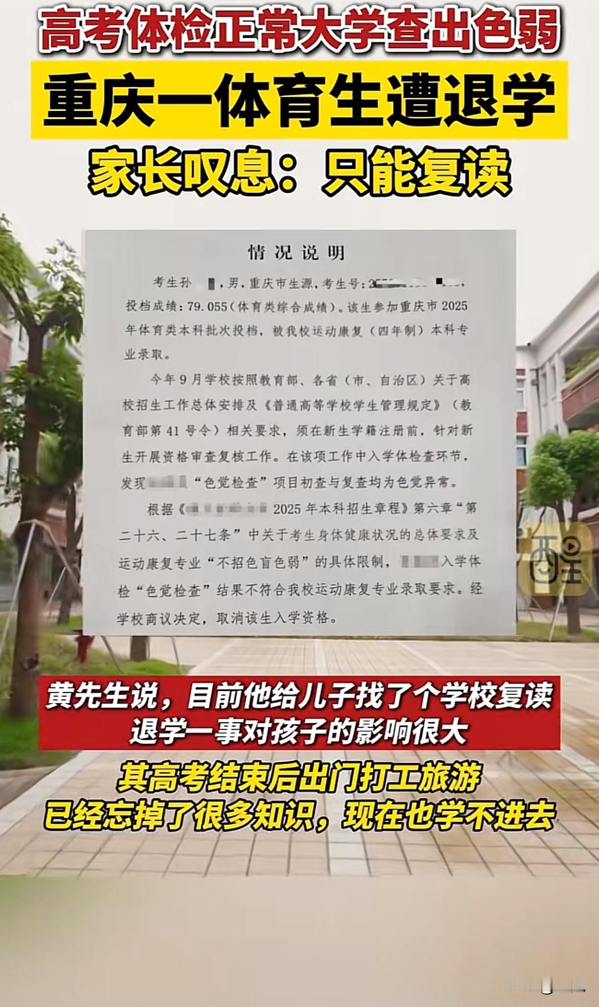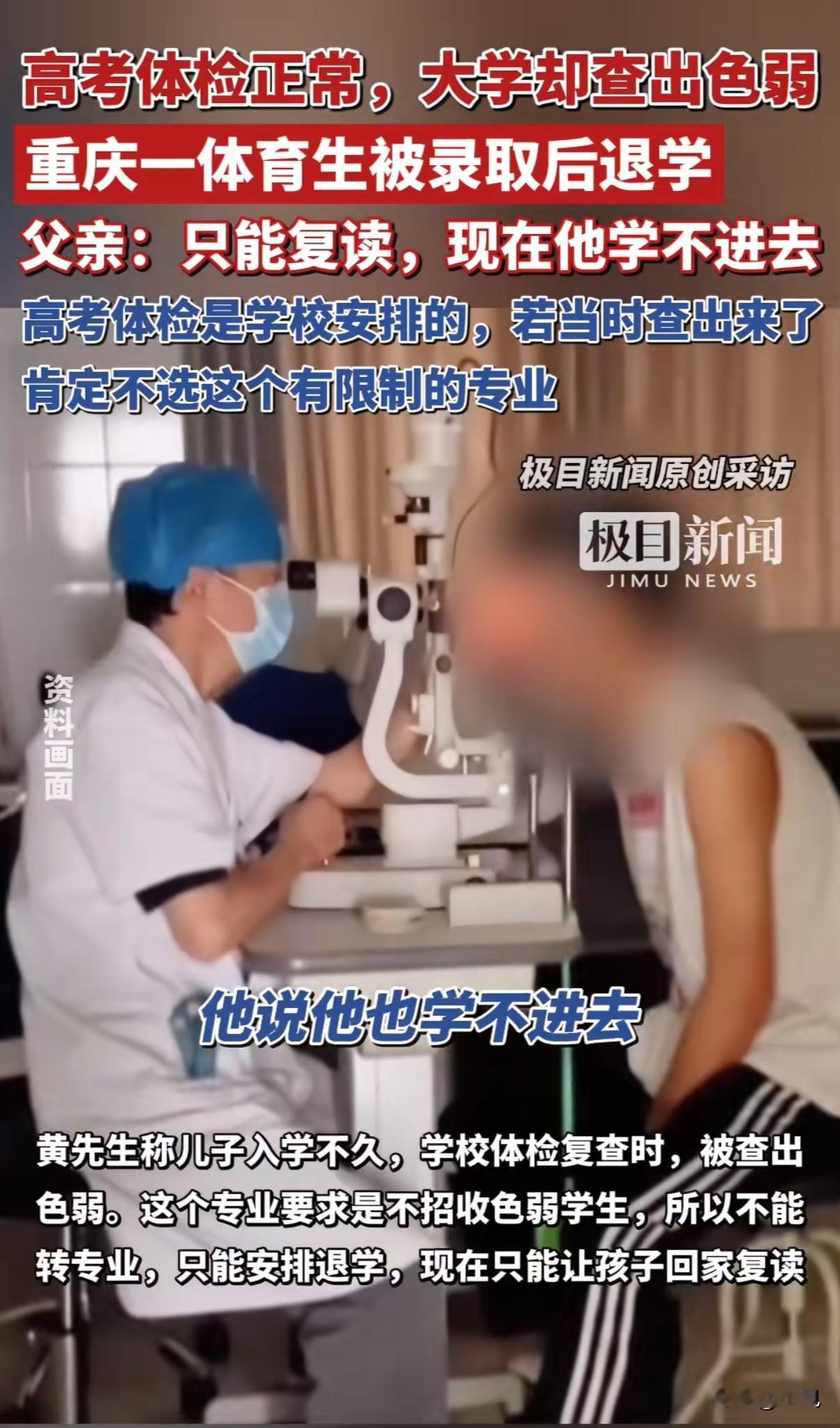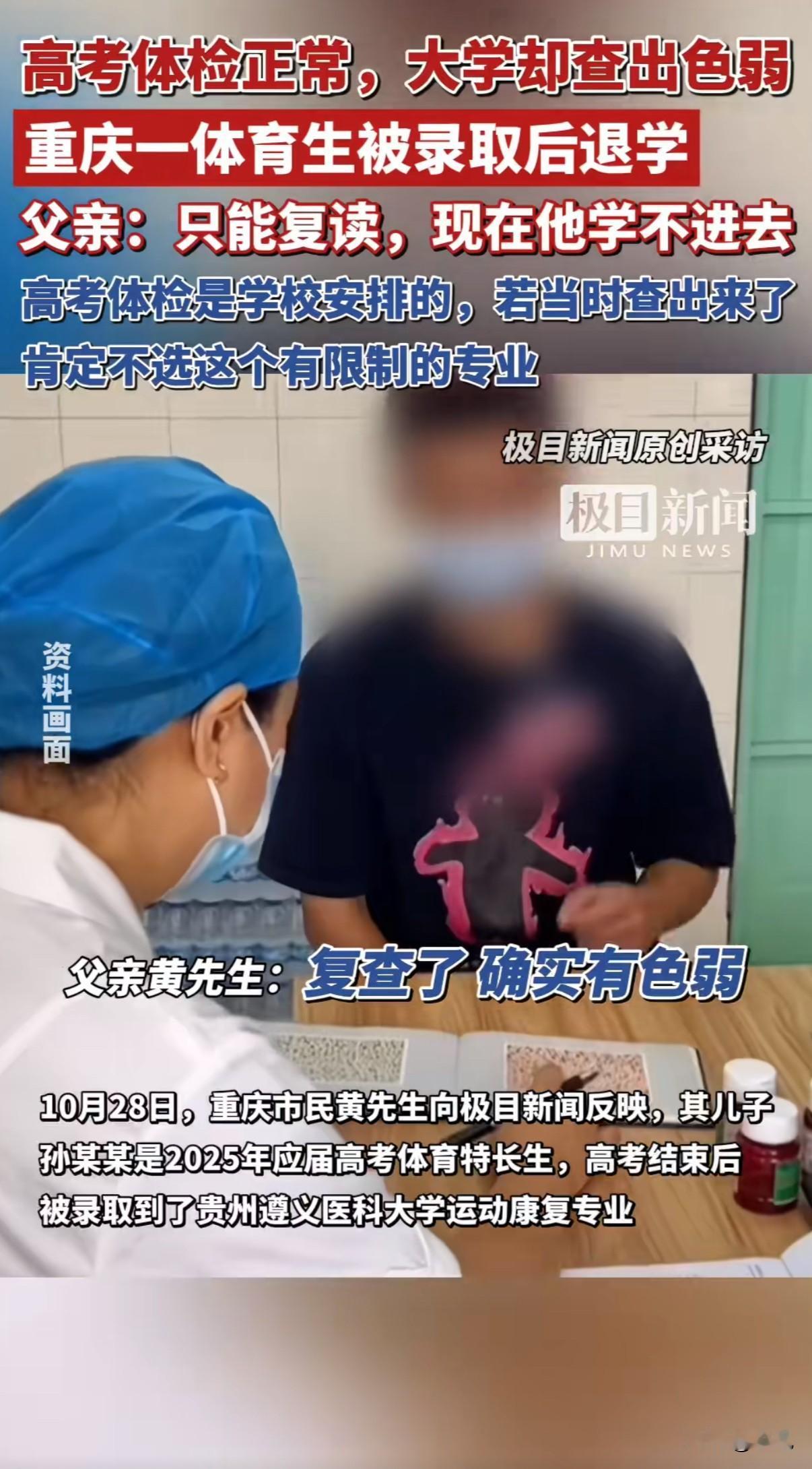 “色弱退学”!重庆一体育生,高考502分,体育87分,好不容易考上遵义医科大学。结果入学十几天,学校体检查出色弱,直接退学了。 可问题在于,他高考体检明明是正常的。 这就很矛盾了。如果真是色弱,为什么高考体检没查出来?如果高考体检准确,为什么大学一查就有问题? 这个学生读的是运动康复专业。查了下招生规定,这个专业确实不招色弱学生。不只是这个专业,很多专业都对色觉有要求。化学、医学、地质、纺织、冶金,甚至计算机的一些专业都有限制色弱。 大学也很无奈,他们按章程办事。两个体育类专业都对色觉有要求,想转专业都没办法。 最惨的是学生本人。高考结束后放松了这么久,知识都忘得差不多了,现在要重新捡起来复读。这种心理落差,不是谁都能承受的。 问题的核心卡在哪儿?高考体检和大学体检为什么结果不一样?是设备问题,还是标准问题,还是操作问题? 有专家说得直接,这就是体检机制有漏洞。张雪峰也评论过,这样退档色弱学生不太合理。 色弱真的那么可怕吗?除了少数特殊专业,大多数工作色弱并不影响。因为色弱就直接否定一个学生的所有努力,这个代价太大了。 这个事情不能就这么过去。需要有人负责,需要完善制度。至少要让体检标准统一起来,让考生能根据准确信息填报志愿。 不然今天是他,明天就可能是别人的孩子。 这样的教训,一次就够痛了。
