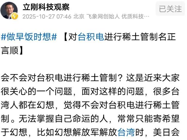 项立刚谈到必须对台积电实施稀土管制,若不加以管制,台积电极有可能成为向美国输送稀土的超级中转站,目前台积电完全倒向了美国,对大陆芯片发展毫无助力,很多先进芯片都不帮大陆代工,也没必要对台积电客气,它是美国高端 AI 芯片唯一代厂,管制台积电能间接卡住美国芯片脖子。 麻烦看官老爷们右上角点击一下“关注”,既方便您进行讨论和分享,又能给您带来不一样的参与感,感谢您的支持! 项立刚最近关于稀土管制的发言,在科技圈引发了不小的震动,他的观点很直接,就是要对台积电实施稀土管制,理由也说得明明白白:如果不管,台积电很可能变成美国获取稀土的超级中转站,这话听起来刺耳,但仔细琢磨,还真不是危言耸听。 先看看数据就知道问题有多严重,2024年大陆向台湾出口了超过6000吨稀土,占出口总量的一成多,这些稀土大部分流向了半导体产业,台积电是最大买家。 它每年要消耗差不多6000吨稀土,其中96%都得从大陆采购,从镧到钕,从铕到钬,这些听起来陌生的元素,恰恰是芯片生产的命根子,没有这些稀土,再先进的光刻机也只能摆着看,生产线照样得停摆。 问题就出在台积电现在的态度上,这几年它把重心往美国挪得厉害,在亚利桑那州砸了上千亿美元建厂,还把几千名核心工程师连人带技术都搬了过去。 更夸张的是,董事会都开到美国去了,这姿态已经很说明问题了,反观对大陆市场,它的营收占比已经跌到10%以下,先进制程的代工说停就停。 当年美国一制裁华为,台积电立马就断了麒麟芯片的供应,到现在都没恢复,这种做法让人寒心,你说它是完全倒向美国,一点都不冤枉它。 更让人担忧的是,台积电现在几乎成了美国高端AI芯片的唯一代工厂,英伟达、苹果这些巨头的高端芯片,都得靠它来生产,凤凰城的工厂一投产,就成了美国AI供应链的核心枢纽。 而这些芯片的生产,恰恰离不开大陆供应的稀土,你想想看,咱们的战略资源,经过台积电的转手,变成了美国卡咱们脖子的工具,这账怎么算都不对劲。 项立刚担心的还不止这些,台湾那边的管理说实话不够严,稀土流向哪里,用在什么地方,很多时候缺乏有效监管,之前就有人走私稀土到泰国、墨西哥,最后流进美国。 现在台积电拿了这么多稀土,万一当个二道贩子,转手卖给美国或者美国企业,咱们岂不是白白送了战略资源出去?更别说还有一部分稀土流向了台湾的军工企业,这就更敏感了。 有人可能觉得,管制稀土会不会伤敌一千自损八百?其实不用太担心,商务部已经出了新规,含中国稀土0.1%以上的产品再出口得拿许可证,台积电生产的4纳米芯片里,镧元素含量就达到0.5%,远超这个红线。 这意味着它要是不拿许可,芯片都没法合法出口,现在台积电的稀土库存只够用一个月,已经开始影响生产了,苹果的订单都延期了,光违约金就赔了十几亿美元,这说明咱们的管制是真能起作用的。 而且稀土这东西,全球90%的供应都在咱们手里,这是实打实的战略筹码,北方稀土、中国稀土这些企业,产能和提纯技术都牢牢握在手里,价格还在涨,根本不愁卖不出去。 反倒是台积电,离了大陆的稀土,它的生产线就得停摆,美国的AI芯片供应也会受影响。 说到底,项立刚的建议不是要搞断供,而是要立规矩,合作可以,但得建立在相互尊重的基础上,你不能一边拿着我的资源,一边跟着别人卡我的脖子,这道理谁都懂。 他提出让台积电交出客户数据和稀土使用情况,派人去监督检查,不配合就不批稀土配额,这要求一点都不过分,咱们有权知道自己的战略资源用在了哪里,有没有被转手送给对手。 这事还有个更深层的意义,管制台积电的稀土供应,能给大陆芯片产业争取宝贵的发展时间,中芯国际、华虹这些企业,技术上还在追赶,缺的就是时间。 如果能通过稀土管制影响台积电和美国芯片企业的产能,让他们的供应链出现波动,咱们正好可以趁这个机会补短板、强弱项,等自主研发跟上了,技术封锁自然就不攻自破。 稀土在手,咱们才有底气跟对手谈规则,这不是要跟谁过不去,而是要守住自己的资源命门,保护自己的产业安全。 项立刚的话虽然听起来强硬,但恰恰说出了很多人的心声:该强硬的时候就得强硬,该守住的底线就得守住。 对此大家有什么想说的呢?欢迎在评论区留言讨论,说出您的想法!
