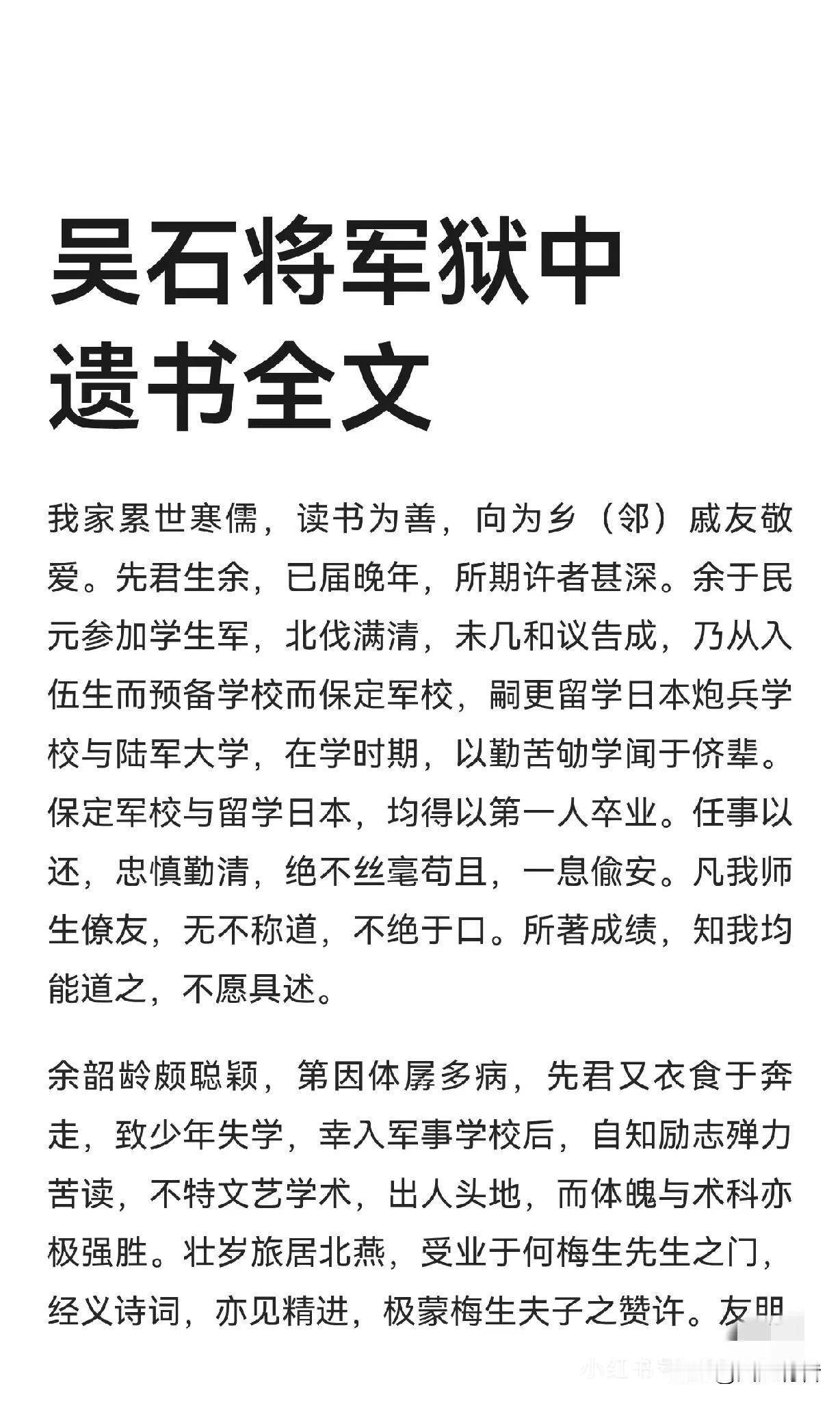 吴石将军的遗书。 央视热播剧《沉默的荣耀》揭开了一段尘封已久的隐蔽战线残酷斗争的往事,曾经陌生的吴石将军成为家喻户晓的英雄。吴石将军英勇就义前在狱中写下的遗书的内容是什么?简单概括就是:一生勤学报国,参与北伐,留学日本,任事勤勉。著有《兵学辞典》等军事著作,抗战期间书籍大都遗失。生活俭朴,与妻女情深。虽一生忠善,终陷囹圄,声名志业成空,唯有丹心可寄泉下。这颗“丹心”指的是什么呢?我们现在已经知道了,那就是理想信念坚定、爱党爱国、不畏艰险,愿为祖国统一大业奉献、牺牲的心!