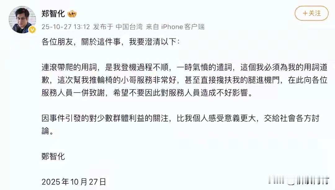 郑智化就深圳机场自己的言语用词道歉了! 宝岛艺人郑智化吐槽内地机场的事件这几天热议不断,先是很多人跟着郑智化的描述谴责机场 结果后来视频监控出来又出现反转,有很多人认为郑智化描述有误。 处于争议漩涡的郑智化出来发声了:首先对自己的遣词用词进行道歉,同时称赞了服务人员的行为并致谢,并希望该事件大家更应该关注这件事给少数群体带来的利益。 真是抬头的一片天是监控的一片天,机场的安保摄像头我竟然没看见,大家都歇了吧,这事就这样了!