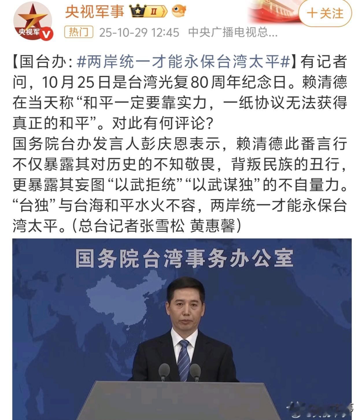 “两岸统一才能永保台湾太平”这句话直指问题核心,岛内蓝白绿都别再糊弄了。 一直以来: 绿营的只强调“和平”,无非就是想掩盖其挑动台海动荡的事实,糊弄大众。 蓝营的只强调“和平”,也是异想天开,妄想维持现状,这种治标不治本的口号经不起推敲。 至于白营,既要绿营的所谓“自由民主”,又要蓝营的单方面“和平”。既贪心又不自量力。 岛内三个颜色阵营,都在各取所需,都在回避统一,都不能寄予厚望。 时间不等人,靠糊弄是解决不了问题的,只有与大陆相向而行,共推最终统一,台湾才能永保和平。