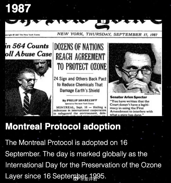 所以在发现臭氧层有巨大空洞后,在1987年,人类商定了一项被载入史册的协议——《关于消耗臭氧层物质的蒙特利尔议定书》。这份协议在全球范围内,开始逐步限制、淘汰那些破坏臭氧层的化学物质。
