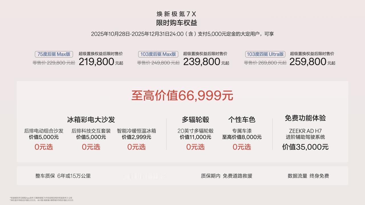极氪7X上市,售价22.98万元-26.98万元,12月31日前可享限时售价21.98万元-25.98万元。单电机车型后置370kW电动机,峰值扭矩535N·m,CLTC工况续航里程有620km和802km两个版本。四驱车型最大功率585kW,峰值扭矩812N·m,0-100km/h加速成绩2.98s,最高车速达到255km/h。