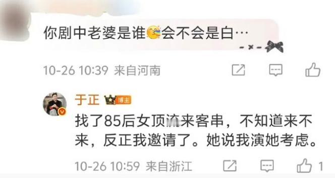 于正说邀请85后女顶流演他老婆! 于正《金吾不禁》演女二父亲,演一个将军,他说邀请了一个85后女顶流来演自己剧中老婆,而且女演员听说是演于正老婆后答应考虑,85后女顶流……赵丽颖?杨幂?刘亦菲?刘诗诗?85后还有其他女顶流吗?