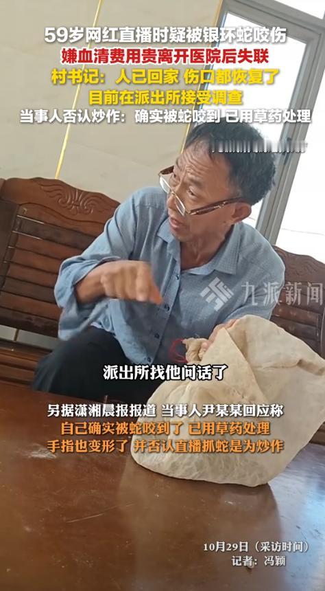 湖南邵阳一男子直播挖蛇,结果被银环蛇咬了,观众都劝他赶紧去打血清,他确实去了医院,结果检查之后,嫌弃血清4000多元太贵,竟然不告而别,至今下落不明,后来救援队发现了男子的踪迹,确定他没事,可是,男子看到救援队和民警后又跑了!知情人:他手机一直关机! 据九派新闻10月29日报道,当天晚上,老尹像往常一样,在野外开着直播,给屏幕前的几百个粉丝表演他的绝活——挖蛇。 就在他把手伸进一个蛇洞里的时候,意外发生了,一条银环蛇猛地窜出来,在他左手食指上狠狠地来了一口。 直播间的观众瞬间就炸了锅,满屏都是催他赶紧去医院的弹幕,老尹当时还算冷静,对着镜头说“出了好多血”,然后就关了直播,连夜开车去了最近的医院。 到了医院,急诊科的医生一看伤口,再听他说是被银环蛇咬的,立刻就严肃起来了,银环蛇的毒可不是闹着玩的,那是神经剧毒,一旦发作,会麻痹人的呼吸系统,不及时打抗蛇毒血清,死亡率非常高。 医生赶紧给他做了检查,告诉他必须立刻住院,注射血清治疗,可问题就出在这血清上,当老尹听到医生说,一支血清要四千多块钱的时候,他脸上的表情立马就变了。 他开始犹豫,嘴里嘟囔着太贵了,医生看出了他的顾虑,还耐心地解释说,这笔费用医保可以报销一部分,不是全都要自己掏。 但老尹似乎没听进去,他心里那杆秤,已经开始疯狂地在钱和命之间摇摆,四千多块,对很多人来说可能不算什么,但对老尹来说,这可是一笔巨款。 他平时一个人住在村里,白天靠帮人卖橘子,一天辛辛苦苦也就挣个两百来块,晚上搞直播抓蛇,也是想多赚点外快补贴家用。 这四千多块,相当于他要不吃不喝干上二十多天,这么一想,他越琢磨越舍不得,就在医生转身去开单子、准备给他办住院手续的那一小会儿功夫,老尹做出了一个让所有人都想不到的决定。 他偷偷摸摸地溜出了急诊室,跳上自己的那辆白色小车,一脚油门就消失在了夜色里,等医生拿着单子回来,发现人已经不见了,再打电话,对方已经关机了。 这下可把所有人急坏了!家人、朋友、村干部,甚至连看了他直播的网友都心急如焚,要知道,那可是银环蛇啊!错过了最佳的救治时间,后果不堪设想。 救援队和民警也迅速行动起来,根据监控和线索,开始了一场全城大搜寻,经过一天多的寻找,终于在一条乡间小路上发现了老尹的车。 附近有村民说,早上还看见他了,在田里转悠,看起来好像没什么事,这个消息让大家稍微松了口气,至少人还活着。 可就在救援人员和民警准备上前跟他接触时,更离谱的一幕发生了——老尹一看到穿着制服的人,就像受了惊的兔子,立马弃车而逃,一头扎进旁边的草丛里,眨眼间就跑得无影无踪。 这下所有人都蒙了,这是演的哪一出啊?难道他不知道大家是在救他吗? 有网友评论说:“银环蛇的毒,怕是都没有他爱钱的毒深!”这话虽然有点刻薄,但也说出了很多人的心声。 为了省下四千块钱,连命都可以不要,这笔账到底是怎么算的?难道他真的以为自己能靠身体硬扛过去吗? 有人猜测,老尹可能不是单纯地怕花钱,他自己平时也拍视频教大家怎么防蛇,还提醒粉丝被毒蛇咬了要马上去医院打血清。 一个懂蛇的人,为什么会做出这么反常的举动?他的好友透露,老尹可能觉得自己懂一些土方子,想回山里找草药自己治,这样就能省下那笔医疗费了。 这种侥幸心理,简直是在拿自己的生命开玩笑,从他被咬伤到再次逃跑,时间已经过去超过48小时了。 虽然他看上去暂时没事,但这并不代表危险已经过去,银环蛇的神经毒素发作有时会比较缓慢,一旦爆发,留给抢救的时间就非常少了。 他每一次躲避救援,都是在把自己的生命往悬崖边上再推一步。 这件事看下来,真是让人又气又心疼。 气的是他的固执和糊涂,为了省钱竟然不顾性命,心疼的是,一个年近六旬的男人,得是被生活逼到了什么份上,才会觉得四千多块钱比自己的命还重要? 这背后反映出的,或许不仅仅是个人的选择,更是底层生活的不易和辛酸,但不管怎么说,生命永远是第一位的,钱没了可以再挣,命要是没了,就真的什么都没了。 希望老尹能早点想明白这个道理,主动走出来接受治疗,也希望所有正在为生活奔波的人,都能爱惜自己的身体。 毕竟,健康地活着,才是对家人最好的交代,也是享受未来一切可能的前提。 信源:九派新闻2025年10月29日——湖南邵阳,