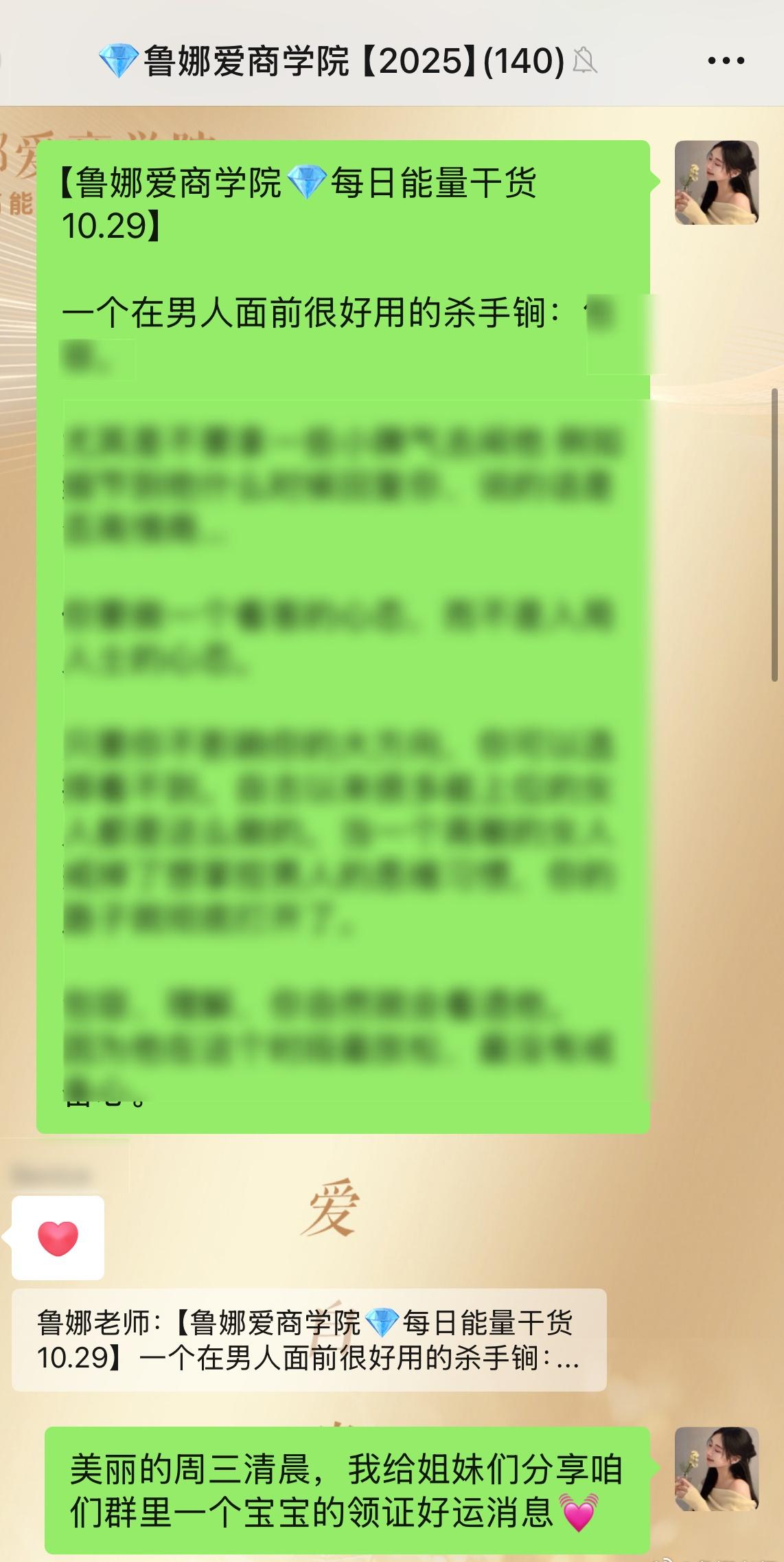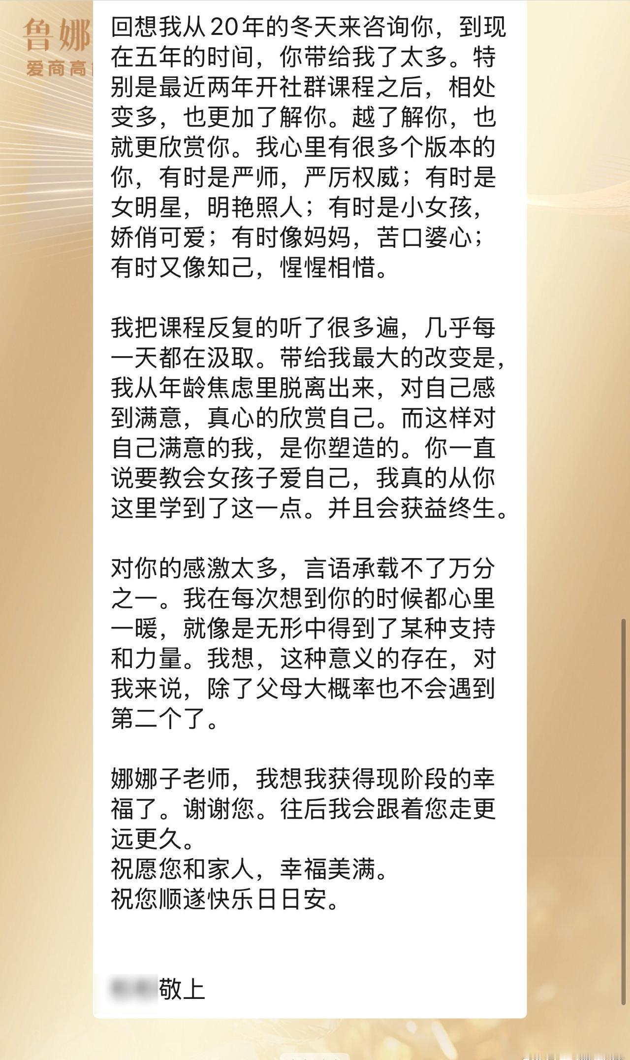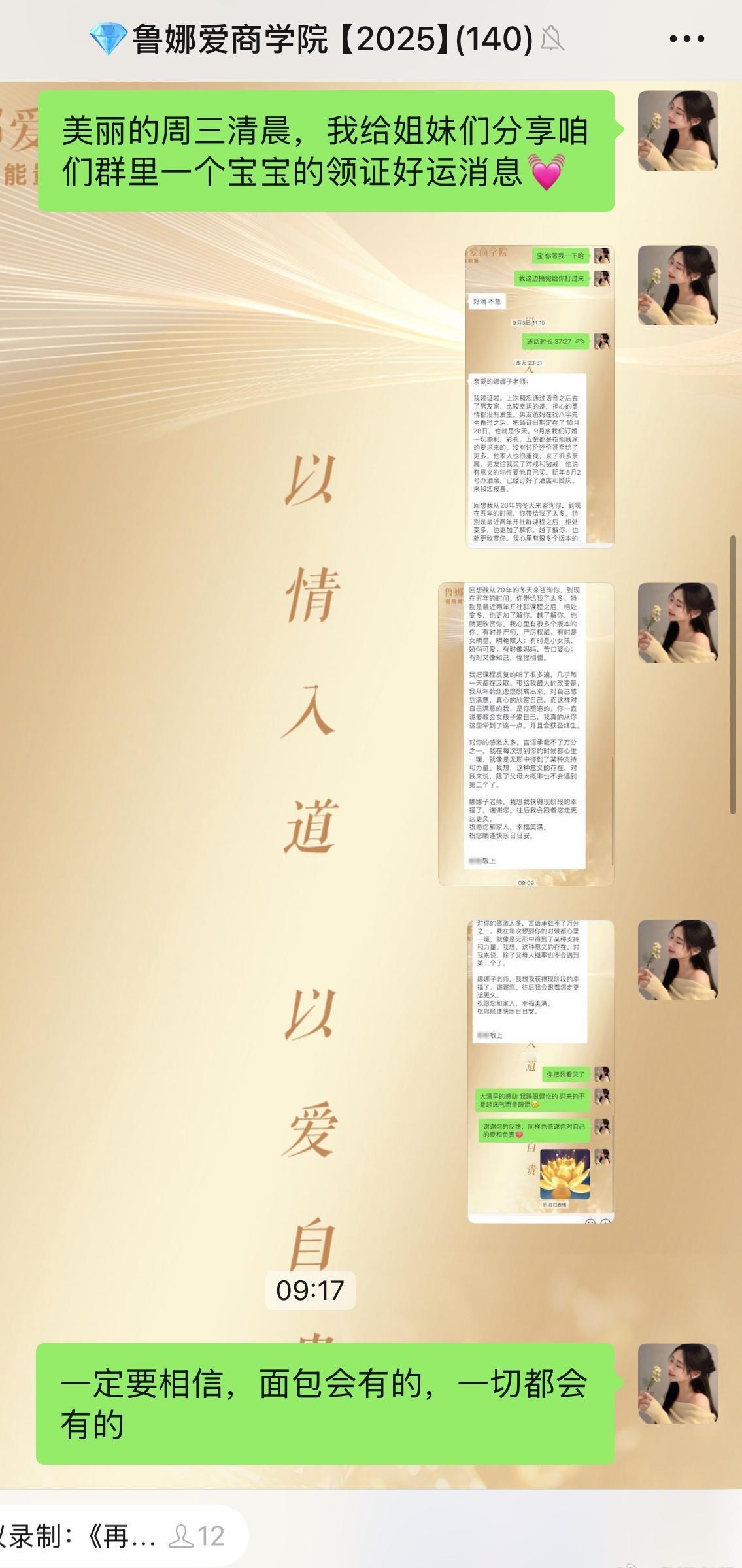 领证啦~恭喜爱商学院的这位老牌学员找到幸福 2014年夏天刚入行的时候,有个男咨询师同事问我:“鲁娜,为什么对学员那么认真?这不就是一份工作么?何必,想着赚多少钱更重要吧” 我记得我当时好好想了想才回答:“感情无助的姑娘她们是没有路的,没人教她们如何生活,没人教她们如何正确去爱一个人。咨询连线是我的工作时间,但可能是她们的一辈子…” 现在11年过来了,我依旧秉持着这句话。把每一个信任我的姑娘送进婚姻的殿堂,让她们过上最幸福的智慧人生。 我的每一句话,都可能会影响着一个女性的三观,并且这么多年越来越感知到我从事这个职业存在的意义。有的女生从初高中、大学就看我写的东西,学我教的内容,到现在已经拥有了属于自己甜蜜的感情和幸福婚姻。 谢谢姐妹们的正反馈,我很感动于这些感恩的文字。还在努力向上幸福生活的宝宝,一定要通过方法找到最好的自己。 爱情是你享受生活的一种方式,而不是唯一目的 记住,你的彼岸是:提升自我,好好成长,认真爱自己。 只有你好了,他才会来。因为蝴蝶——自会引花香。