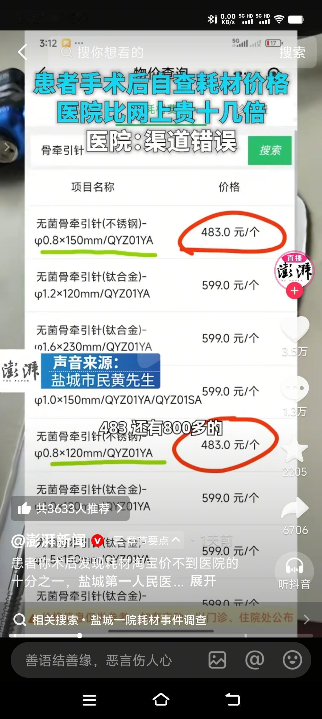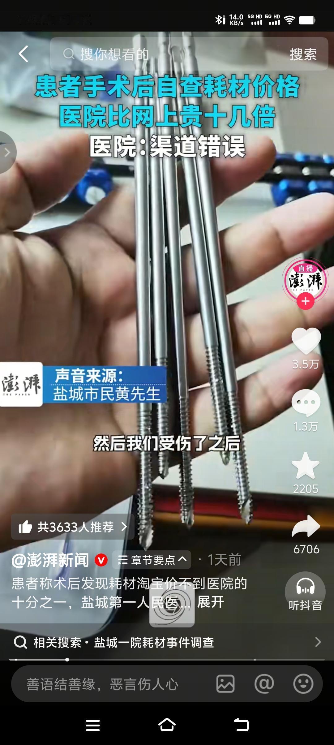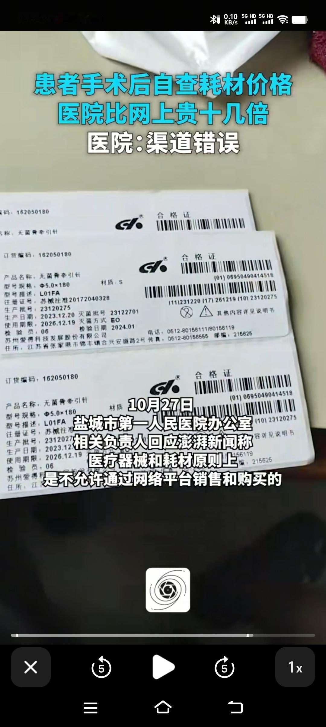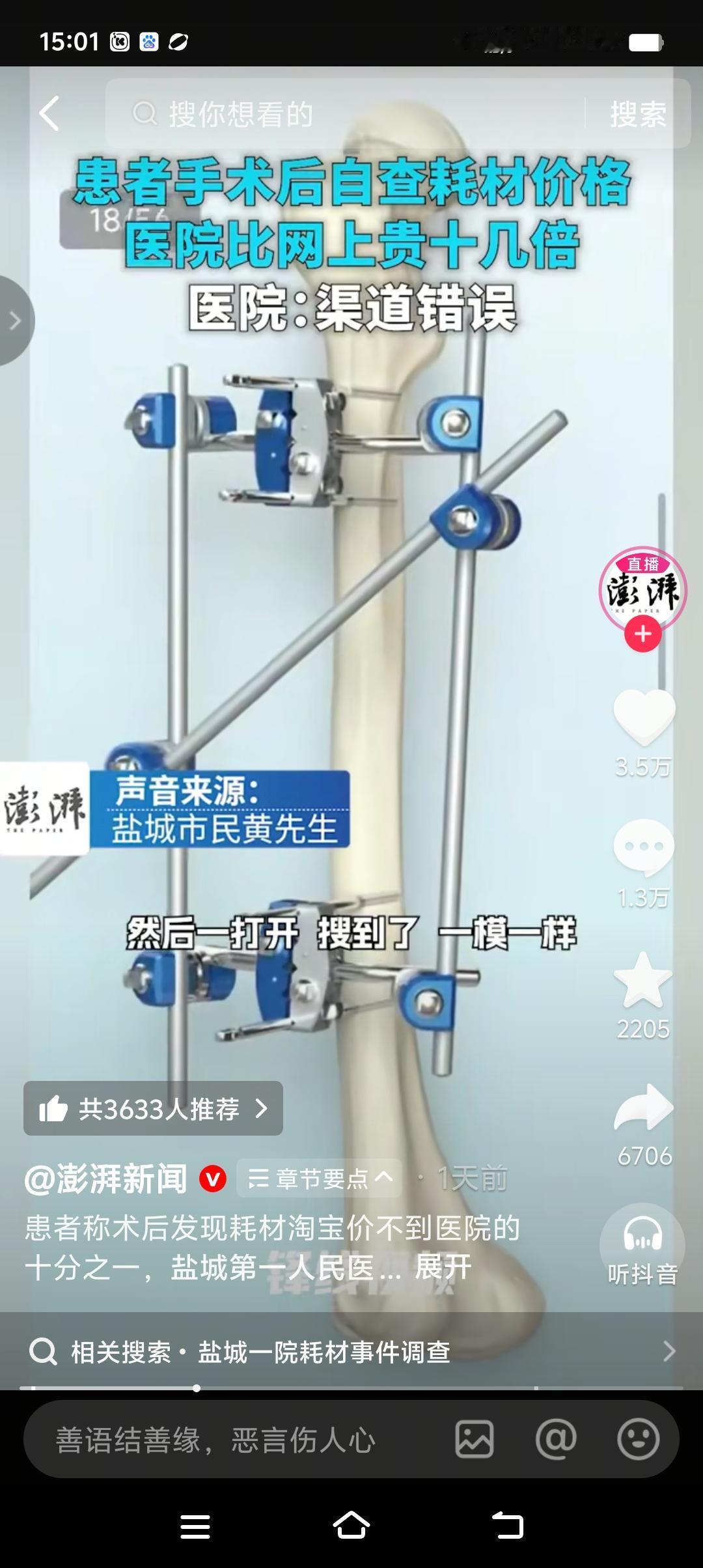 “140块钱的东西,到了医院里面成了2200块钱”,医院到底是救死扶伤的地方,还是坑你没商量的地方? 总共8万元的骨折手术费,其中器械费花了18590。一根国定骨折的针杆夹,医院卖2200元,网上同一厂家、同一型号、同一编码、同一名称、同一规格售价140。从网上购买需要1800的器械费,到了医院整整贵了10倍还多。患者反映问题的时候,院方又把价格调成了895。对于患者提出的疑问,院方给出的答复是“医疗器械是不允许通过网络平台销售和购买的,院方都是通过阳光平台采购的,所有的药品和器械卖给患者都是0差价”。在这里我想说的是,既然是0差价,那你为什么还要调价呢?这不是自相矛盾,难圆其说吗! 山西太原有五家医院被罚,其中白求恩医院最高罚款1177.598万。所以说医院一旦变成敛财的工具,那么受到伤害最深的就是患者了。