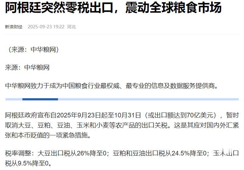 阿根廷大豆变脸,人民币结算成为关键! 9月22日,阿根廷政府突然抛出重磅政策——将大豆出口关税直接砍至零。消息一出,不仅阿根廷国内的农场主们精神一振,全球农产品贸易圈都炸开了锅。 谁都没想到,政策落地还不到48小时,中国企业就迅速出手,一口气锁定了130万吨大豆订单。更让人眼前一亮的是,这次交易彻底打破了阿根廷大豆出口几十年只认美元的老规矩,几乎全用人民币来结账,这一下可成了中阿贸易合作里实打实的新里程碑。 而要说起为啥阿根廷会突然这么干,其实都是经济压力逼出来的。 这几年阿根廷日子不好过,欠的美元外债一大堆,手里能花的美元储备却越来越少,连日常进口物资都快周转不开了。阿根廷也是靠卖大豆吃饭的,大豆出口占了全国出口收入的近三成。 然而,在这之前33%的出口关税虽然能让政府多收点钱,但也让自家大豆在国际市场上没了价格优势,不少买家都转头去买别的国家的大豆。 据阿根廷经济部公布的数字,2023年他们的大豆出口额比前一年少了12%,外汇收入一减,还债就更难了。在这种两难的情况下,降关税吸引买家,再换种结算货币减少对美元的依赖,就成了阿根廷缓解压力最直接的办法。 而中国是全世界最爱买大豆的国家,一年得用掉1亿多吨大豆,用来榨油、做饲料,而阿根廷一直是我们第三大大豆供应商。 根据中国海关总署的统计,2023年我们从阿根廷买了800万吨大豆,占了总进口量的15%。这次关税降到零之后,阿根廷大豆运到中国的成本每吨能省下来约30美元,价格优势一下就凸显出来了。 国内的粮油企业早就盯着这个机会,采购团队连夜加班,电话、视频会议连轴转,短短两天就和阿根廷方面敲定了130万吨的订单,这个量比去年同期一个月的进口量还多一倍。 这次合作最关键的突破,还是结算方式的改变。以前不管卖给哪个国家,阿根廷大豆都得用美元结账,可现在他们手里美元紧张,换成人民币结算就解决了大问题。 阿根廷经济部长在发布会上说,用人民币结账不仅不用再担心美元汇率涨涨跌跌的风险,手里攒下的人民币还能直接用来买中国的机械设备、电子产品,一举两得。 而对我们来说,好处也很实在,稳定的大豆供应能保证我们的食用油和饲料加工企业不缺原料,老百姓的餐桌供应也更有保障。而人民币结算的推广,也让更多国家看到用人民币做贸易结算的便利,为人民币走向国际添了一把力。 这种双方都能受益的合作模式,不光帮阿根廷打开了新的贸易路子,也为中阿以后在农产品、能源等更多领域的合作铺好了路,可以说是实实在在的双赢。