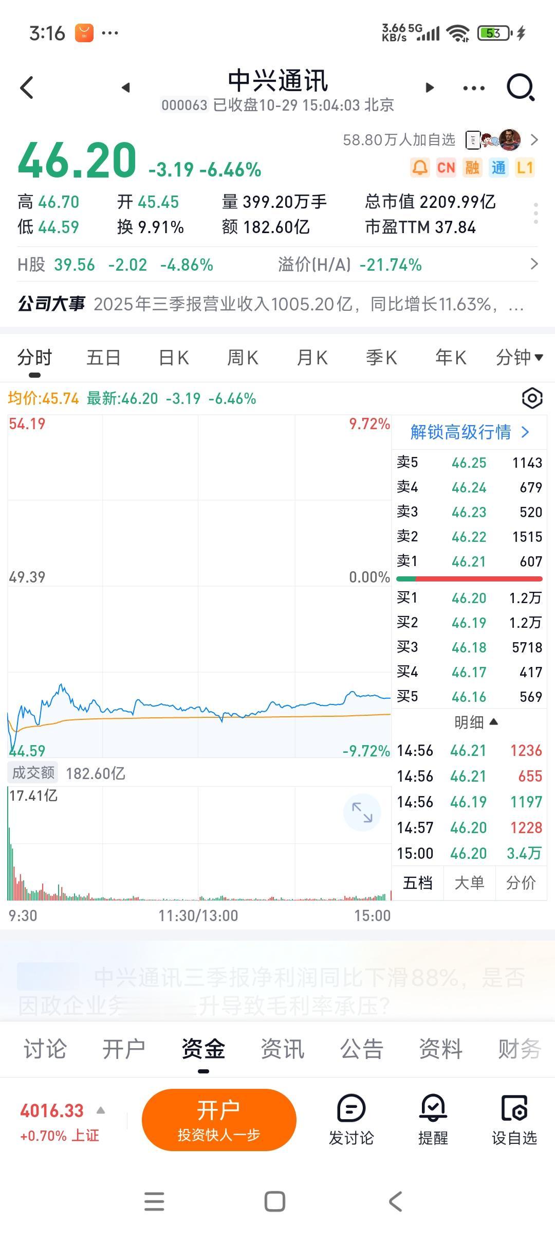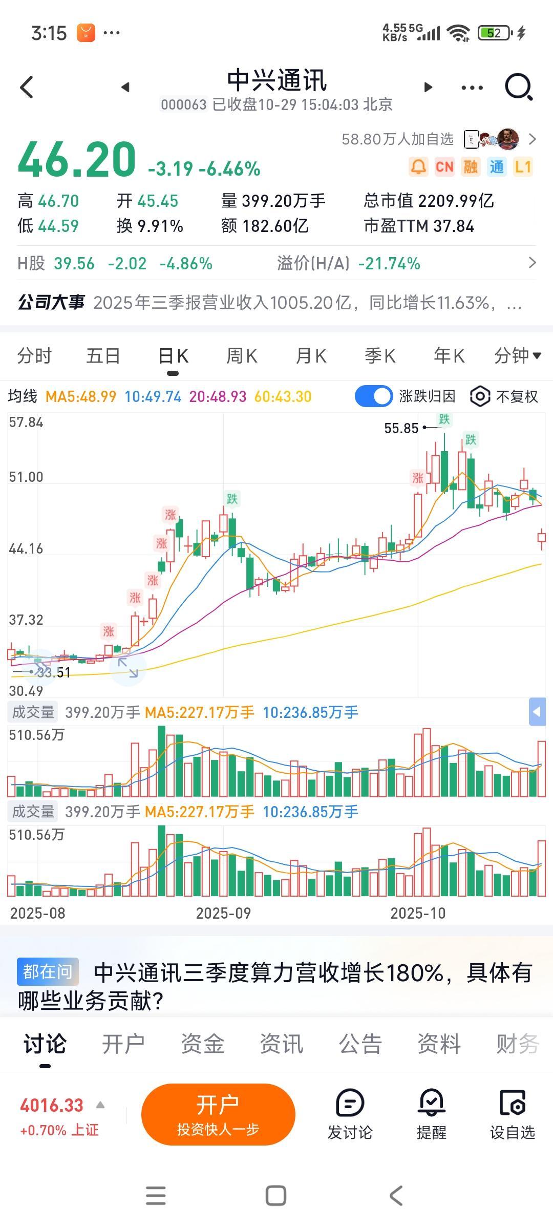 得益于大盘的大涨,中兴通讯没有跌停,收在46块上方... 今天早上开盘五分钟成交量就超过50亿,半个小时内超100亿,但均未打到跌停板...由此看来,资金的承接力还是很猛的... 也许市场对于中兴通讯三季度业绩有分歧,有人不看好,也有人觉得它隐藏了利润,比如三季度营业成本同比为何突然增加了50亿之多?存货为何也增加了四五十亿? 老牌科技股因为体量大,里面的关系错综复杂,要转型的话,往往会有诸多问题...此刻就需要有大刀阔斧之人来做变革... 中兴通讯是否能转型成功,还待时日... 目前就股价来说,尚未企稳,也不急于抄底吧...其实,外面好股那么多,也不必在一棵树上吊死...