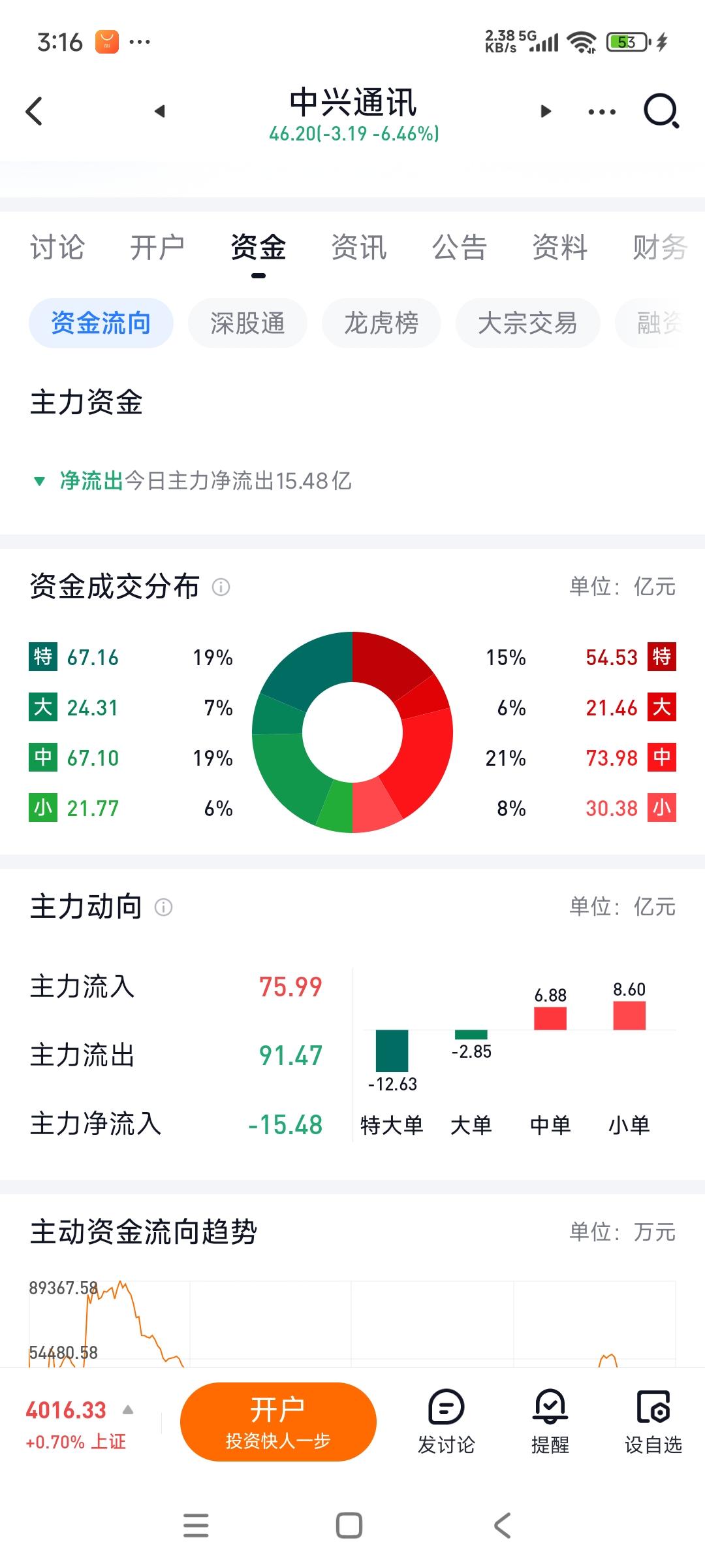 得益于大盘的大涨,中兴通讯没有跌停,收在46块上方... 今天早上开盘五分钟成交