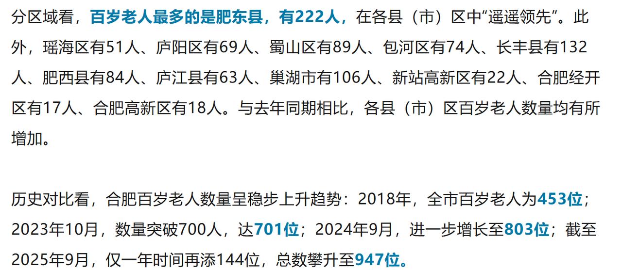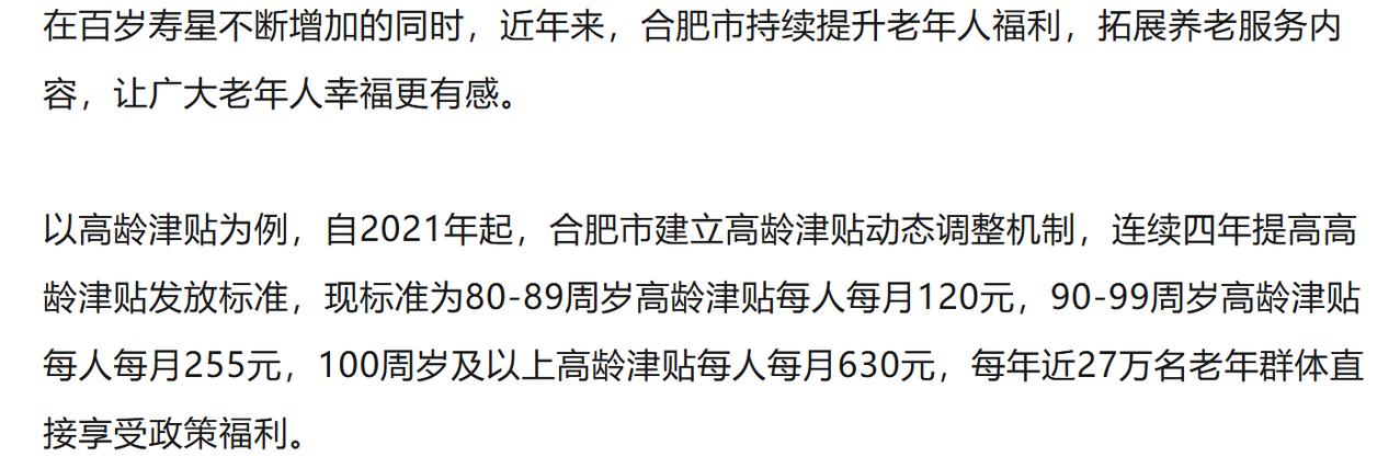 合肥百岁老人有947位,看来合肥也是长寿之乡。从区域来看,百岁老人最多的是肥东县,有222人。合肥给的政策福利是,百岁以上的老人津贴每人每月630元。 看来大家还是要好好活着,争取活到一百岁,后面政府发的钱也不少。