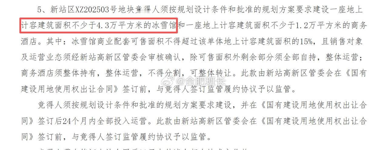 冰雪世界落户新站区,已正式挂地! 新站区XZ202503号地块竞得人须按规划设计条件和批准的规划方案要求建设一座地上计容建筑面积不少于4.3万平方米的冰雪馆和一座地上计容建筑面积不少于1.2万平方米的商务酒店。 冰雪馆商业配套可售面积不得超过该单体地上计容建筑面积的15%,且销售对象及运营业态须经新站高新区管委会审核确认,除可售面积外剩余部分须全部自持,整体运营。