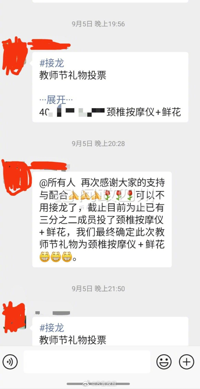 妇女节送蝴蝶兰,端午节送车厘子,教师节送颈椎按摩仪和鲜花......根据爆料网民提供的信息,涉事家委会对于老师真可谓“关怀备至”。每逢节日必有礼品送达,几乎节节不落。爆料网民提供的材料不仅有班费的开支明细,还有聊天记录截图作为佐证,可信度很高。