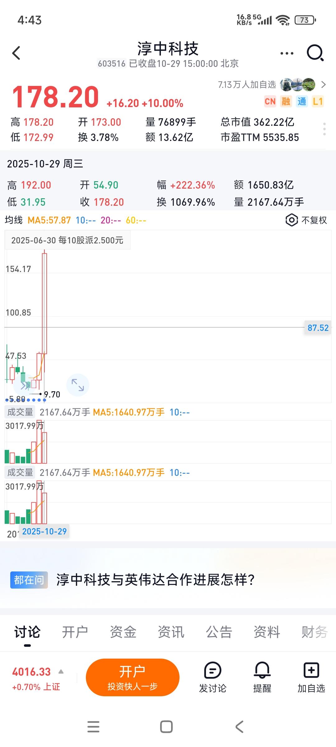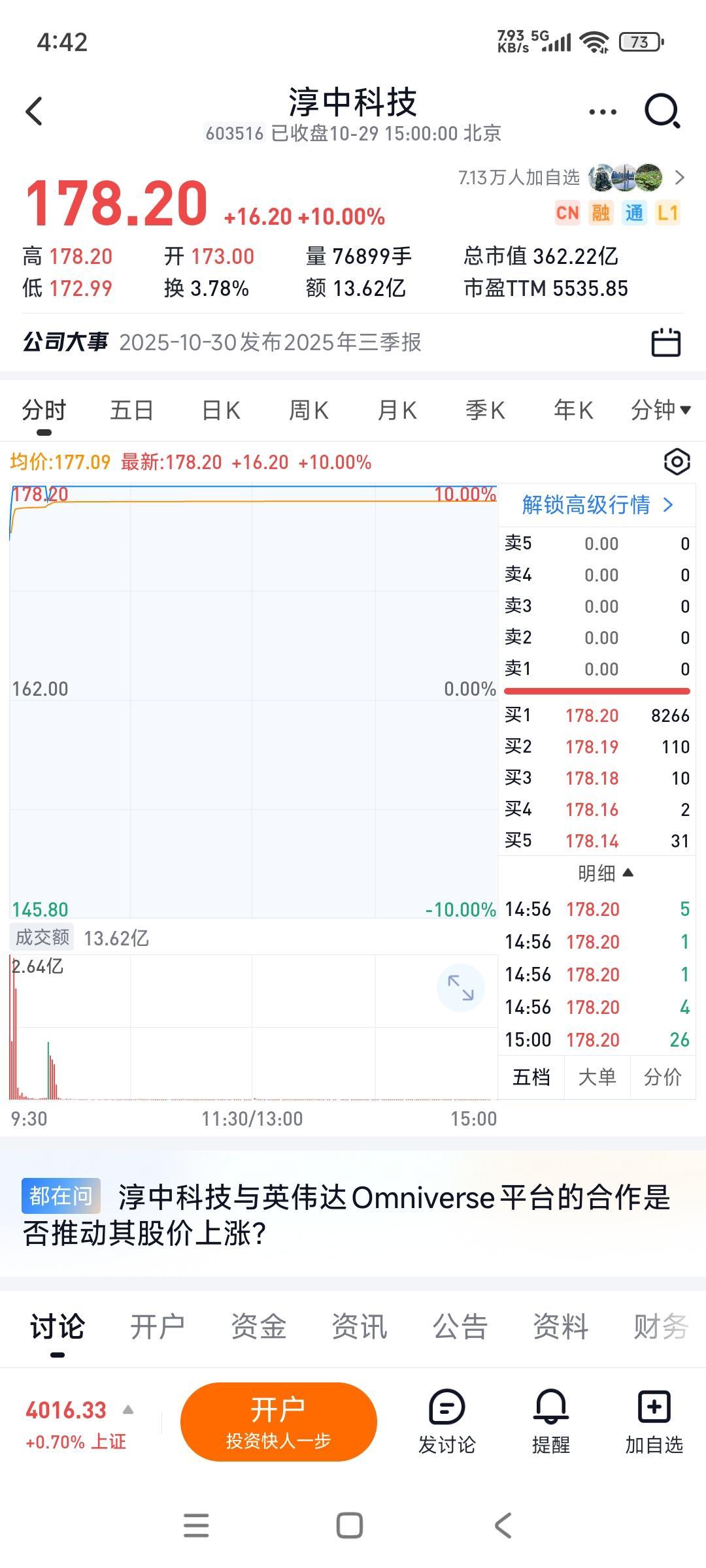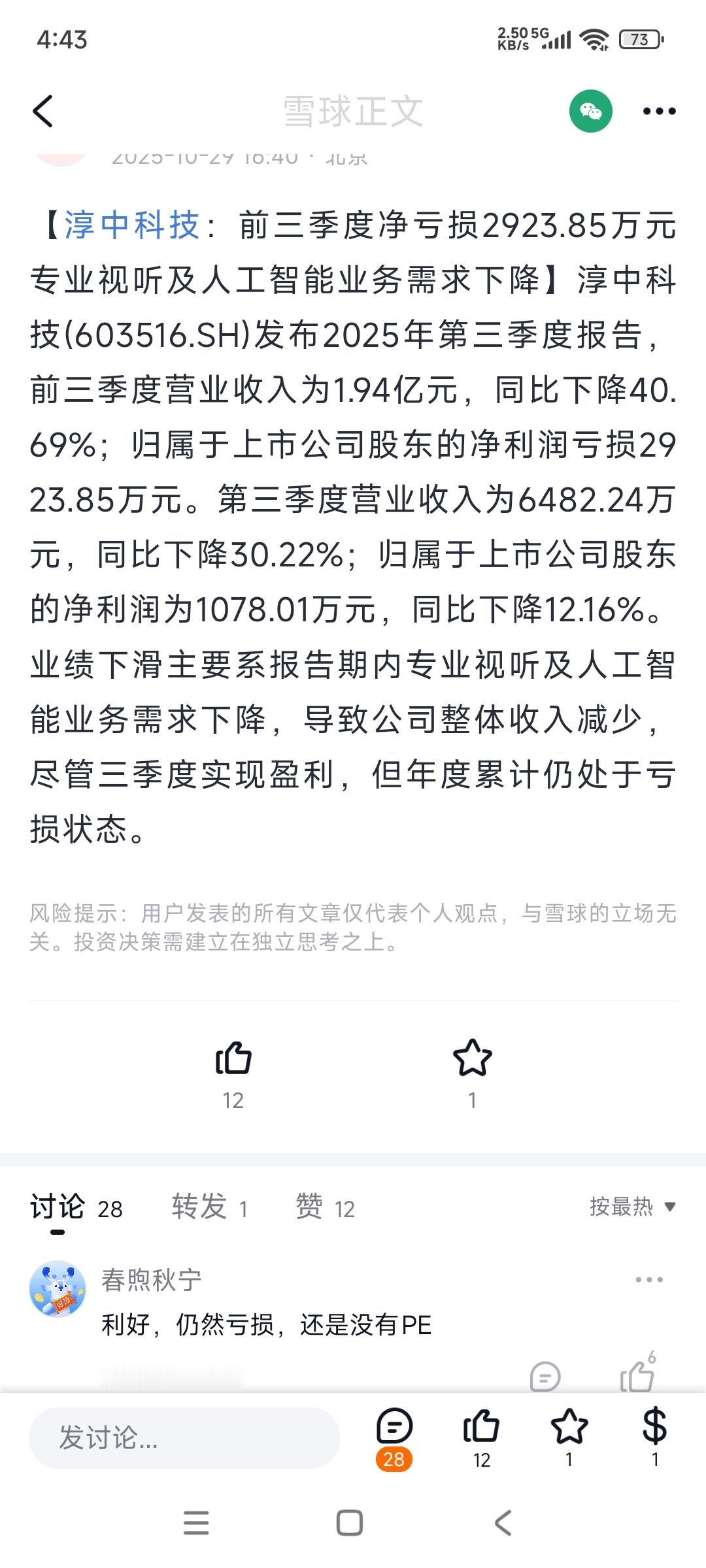 淳中科技今天涨停了,今年股价也因为芯片与人工智能概念而大涨了两倍多,市盈率高达5000多倍...然而一看业绩,三季度营收与净利润都同比大跌,没有业务扩张,利润也不行,只因为挨了一点儿概念,股价就上天了... 这市场,有时候,太畸形了...