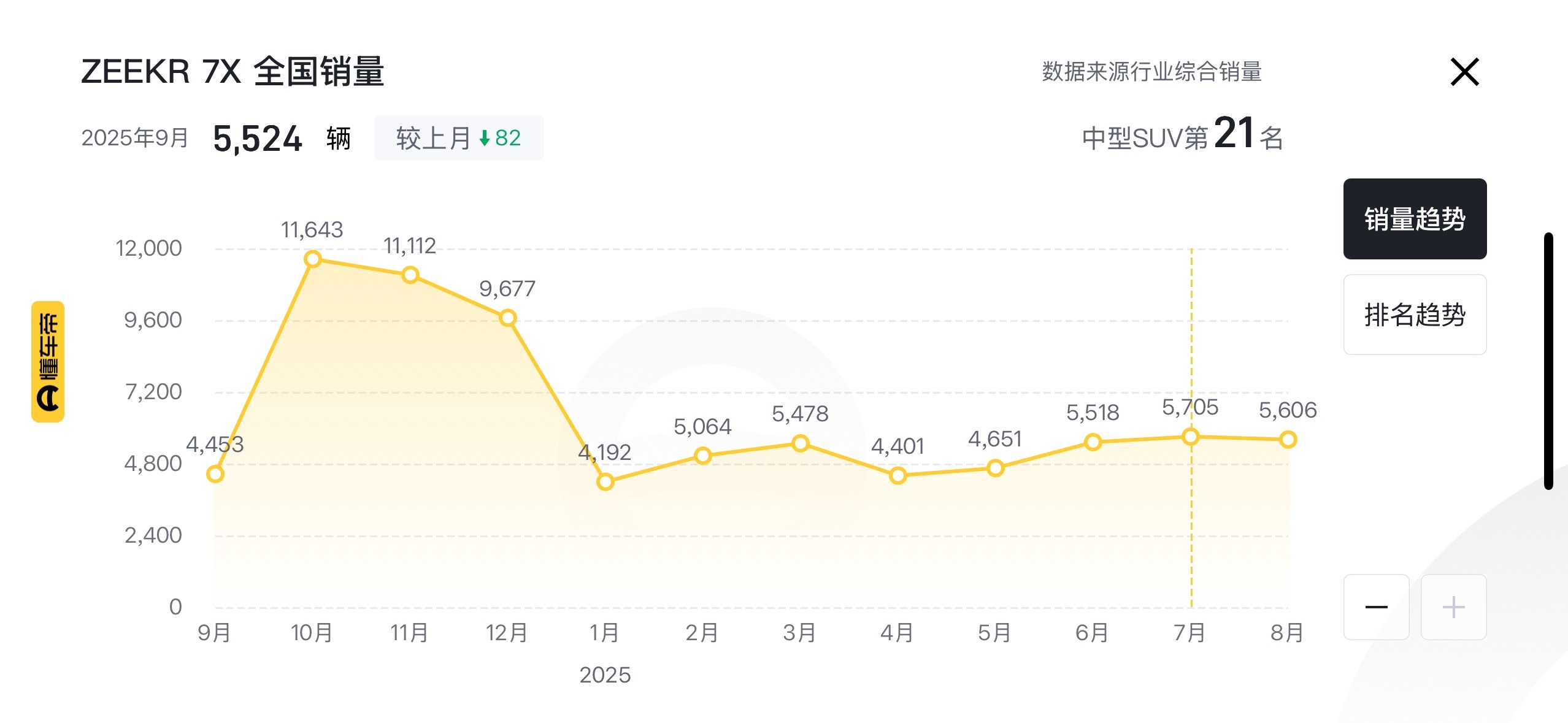 后来我的制片大哥提了7X,现在已经2万多公里了,极氪7X的销量也不错,老款8月份还卖了5600多。